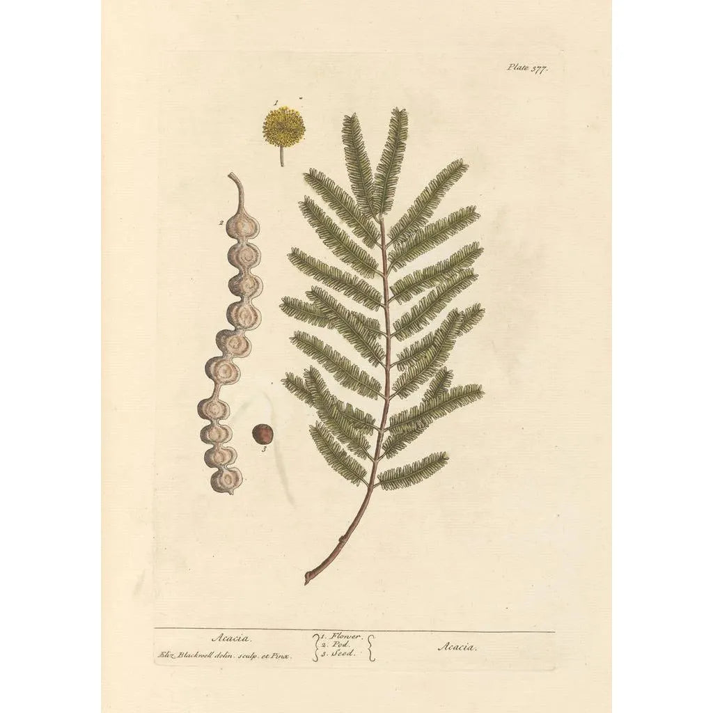 L'œuvre Acacia av Elizabeth Blackwell är en verklig hyllning till blommande skönhet. De delikata nyanser av grönt och gult blandas harmoniskt och skapar en lugnande och livgivande atmosfär. Tekniken för koppargravyr, som används av konstnären, möjliggör fångst av de minucösa detaljerna i blad och blommor med en anmärkningsvärt precision. Varje element i kompositionen tycks vibrera under ljuset och bjuder in betraktaren att fördjupa sig i en värld där naturen blomstrar i all sin prakt.