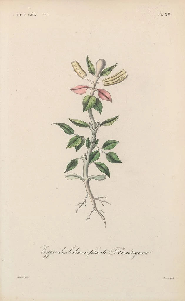 Den konsttryck av Traité de botanique générale Pl020 fördjupar oss i en värld där naturen lyfts fram med en enastående precision. De livfulla färgerna och de noggranna detaljerna av växterna, presenterade mot en fin bakgrund, skapar en atmosfär som är både lugnande och fascinerande. Konstnärens teknik, som kombinerar akvarell och teckning, möjliggör fångsten av de flyktiga skönheterna hos växterna, och bjuder in betraktaren till en noggrann eftertanke. Varje blad, varje blomblad verkar berätta en historia, och avslöjar rikedom och mångfald i den växtliga världen.