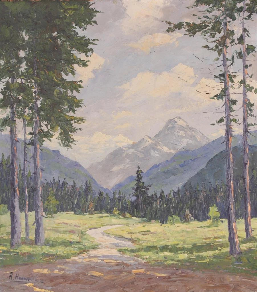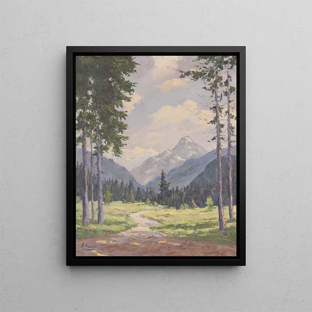 Reproduktion Almlandschaft - Alois Hernick – Introduktion fängslande L'œuvre "Almlandschaft" av Alois Hernick väcker omedelbar fascination genom sin slående skildring av de alpina landskapen. Denna målning, som illustrerar en panoramautsikt över ett alpint dalområde, förflyttar betraktaren till naturens hjärta, där skönheten hos snötäckta toppar och gröna ängar smälter samman i harmoni. Hernick lyckas fånga bergens lugn och majestät, och bjuder in till djup eftertanke. Det mjuka ljuset som badar scenen verkar dansa över ytorna och skapa en nästan drömlik atmosfär. Genom detta konstverk erbjuder konstnären oss inte bara ett landskap, utan en sensorisk upplevelse som resonerar med de djupaste känslorna. Stil och unikhet i konstverket Alois Hernicks stil utmärker sig genom sin förmåga att kombinera realism och impressionism. I "Almlandschaft" framhävs penseldragen med delikata nyanser och livfulla färger som ger en känsla av rörelse och liv, samtidigt som de behåller precision i detaljskildringen. Träd, klippor och moln är målade med sådan finhet att de nästan känns påtagliga. Hernick använder en rik palett som speglar naturens variationer, från de glänsande gröna ängarna till de grå och vita topparna. Detta färgval, i kombination med en balanserad komposition, ger verket djup som drar in betraktarens blick och inbjuder till visuell utforskning. Varje element i målningen är arrangerat för att skapa en visuell berättelse, där betraktarens blick leds genom landskapet och upptäcker naturens subtiliteter. Konstnären och hans inflytande Alois Hernick, en framstående figur inom landskapsmåleri, har lyckats etablera sig som en mästare i att skildra naturen. Påverkad av de stora mästarna inom landskapsmåleri, har han utvecklat en personlig stil som förenar tradition och innovation. Hans verk, ofta inspirerade av österrikiska landskap, vittnar om en djup koppling till sin omgivning. Hernick har fångat essensen av de platser han målade, och förvandlar varje målning till ett öppet fönster mot den naturliga världen. Hans konstnärliga vision har påverkat många samtida, och