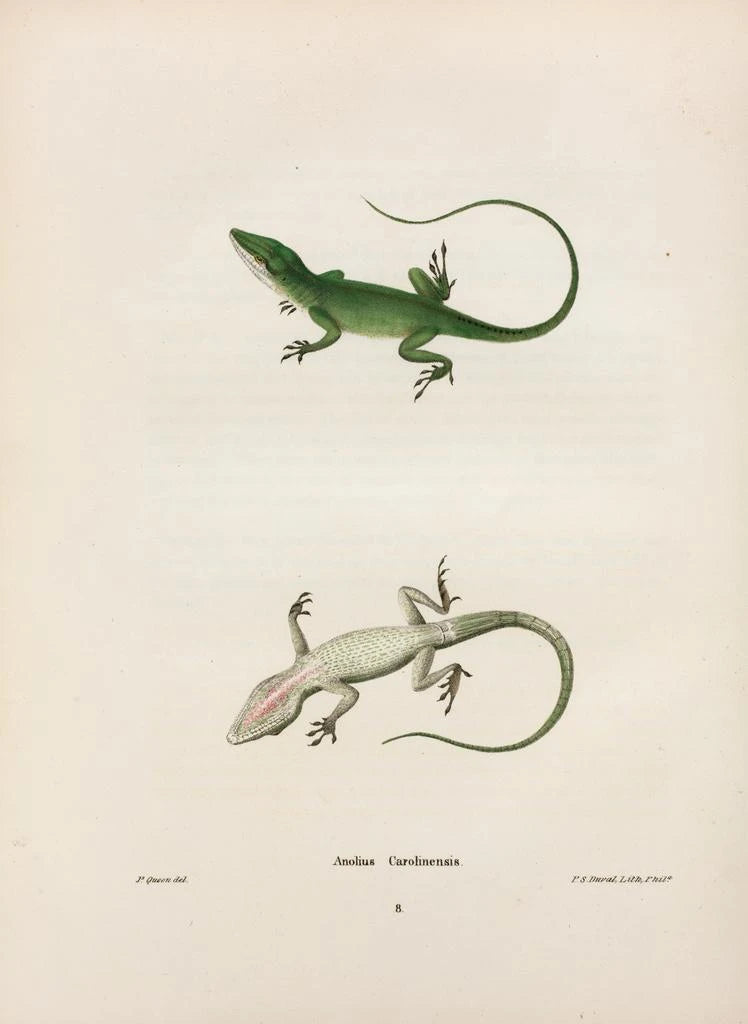 John Edwards Holbrook, naturalist och illustratör från 1800-talet, spelade en avgörande roll i dokumentationen av den amerikanska faunan. Hans verk, ofta inspirerade av hans utforskningar, speglar en passion för vetenskap och konst. Holbrook påverkades av upptäckterna från sin tid, särskilt av Charles Darwin, och strävade efter att kombinera vetenskaplig noggrannhet med en fängslande estetik. Hans arbete med reptiler och amfibier har inte bara berikat kunskapen om dessa arter, utan också satt en standard för zoologisk illustration. Anolis de Caroline är ett av hans många mästerverk som vittnar om hans engagemang för naturen.