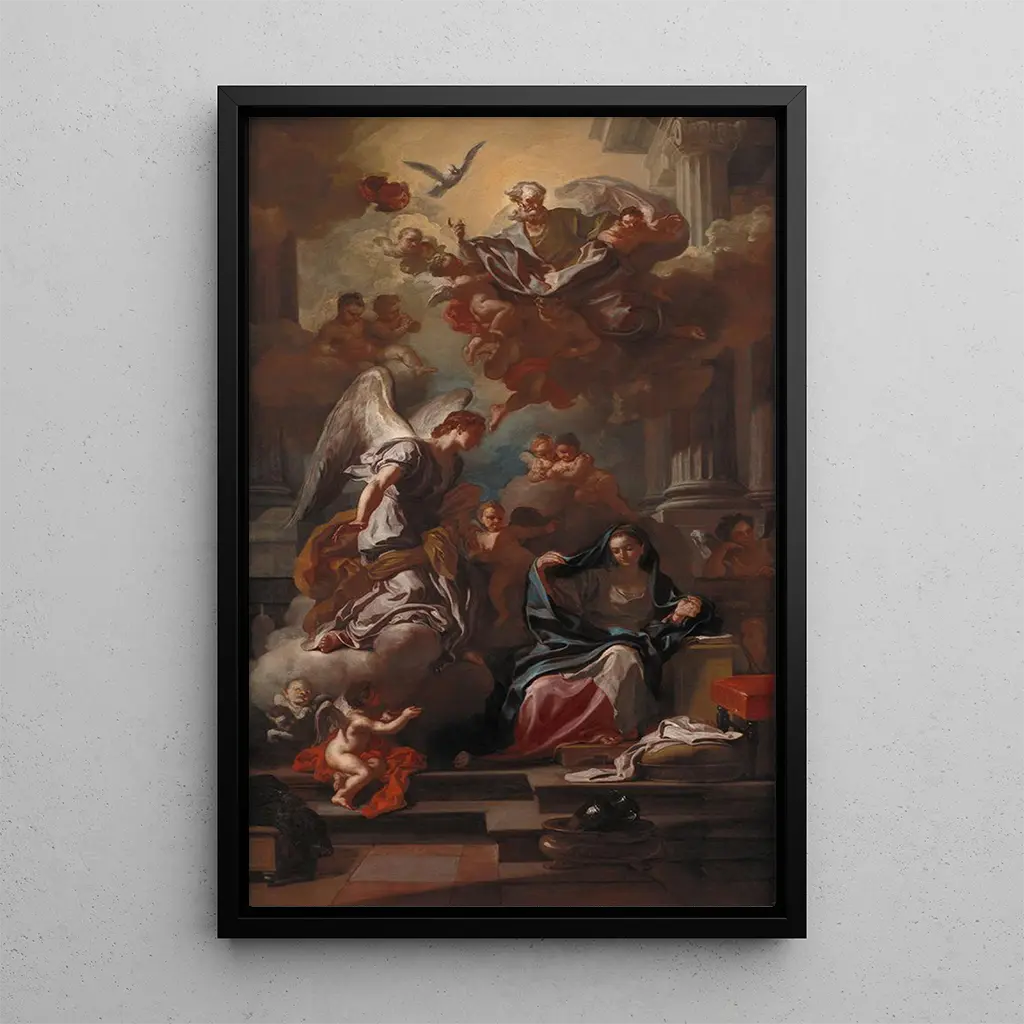 Den konsttryck av L'Annonciation av Francesco Solimena fångar ett ögonblick av nåd där det gudomliga möter det mänskliga. De delikata färgerna och de noggranna detaljerna skapar en atmosfär av lugn och mystik. Scenen, där ängeln Gabriel meddelar Jungfru Maria att hon ska bära Kristus, återges med en anmärkningsvärt stark känslomässig intensitet. Draperierna i kläderna och ansiktsuttrycken vittnar om Solimenas talang för att uttrycka djupa känslor, vilket förvandlar detta heliga ögonblick till en fängslande visuell upplevelse.