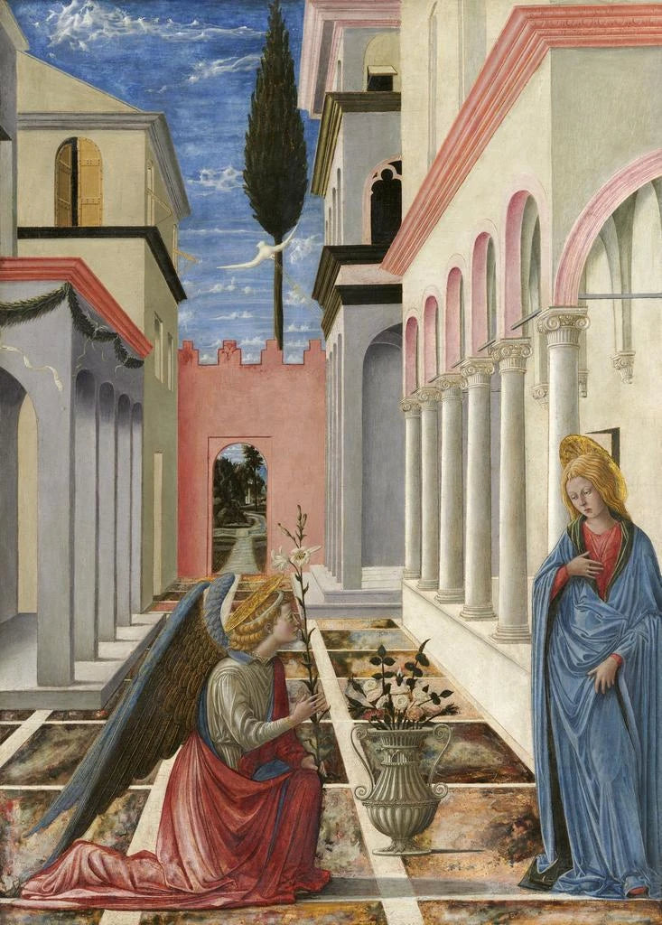 L'annonciation, œuvre emblématique de Fra Carnevale, capte l'instant sacré où l'archange Gabriel annonce à la Vierge Marie qu'elle concevra le Fils de Dieu. La composition est marquée par une harmonie délicate, où les couleurs pastel se mêlent à des touches de doré, créant une atmosphère à la fois sereine et mystique. La technique de la tempera sur bois permet de rendre les détails avec une précision remarquable, des drapés des vêtements aux expressions des visages. Chaque élément de cette toile semble vibrer d'une spiritualité palpable, invitant le spectateur à contempler ce moment décisif de l'histoire chrétienne.