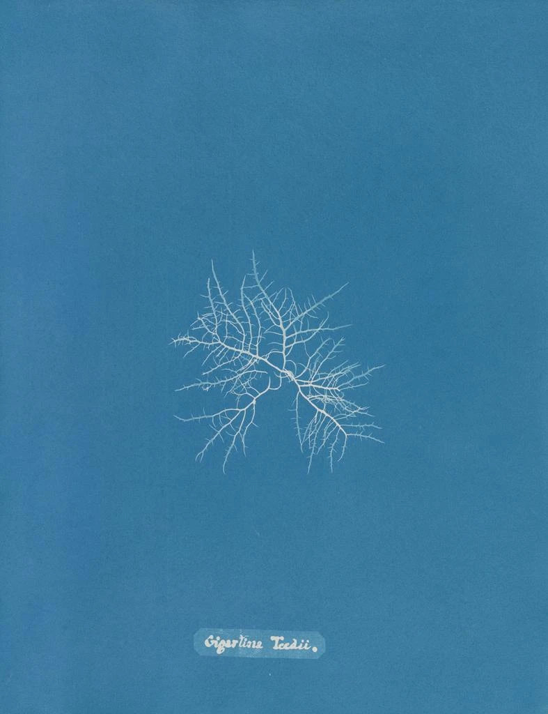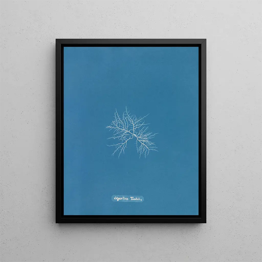 Konsttryck C'est à toi - Anna Atkins – Introduktion fängslande I det stora konsthistoriska panoramat utmärker sig vissa verk genom sin förmåga att överskrida tiden och fånga själva essensen av naturen. "C'est à toi - Anna Atkins" tillhör denna tradition och erbjuder en poetisk fördjupning i världen av alger och växter. Anna Atkins, pionjär inom botanisk fotografi, lyckades förena vetenskap och estetik, vilket skapade verk som inbjuder till eftertanke och reflektion. Detta konstverk, i skärningspunkten mellan konst och vetenskap, vittnar om en tid då utforskningen av den naturliga världen skedde genom innovativa metoder, och banade väg för en ny form av konstnärligt uttryck. Stil och unikhet i verket Annas Atkins stil kännetecknas av en unik metod för fotografi. Hon använder cyanotypitekniken, en teknik som ger djupa och livfulla blåa impressioner. I "C'est à toi" framhävs varje algart noggrant, vilket avslöjar organiska former av slående skönhet. Kompositionen, som är enkel men sofistikerad, inbjuder betraktaren att stanna upp vid detaljerna och uppskatta Atkins noggrannhet. Hennes förmåga att fånga ljuset och leka med skuggorna ger verket en nästan eterisk dimension, där varje element tycks sväva i ett suspenderat utrymme. Denna dialog mellan naturen och den fotografiska tekniken gör detta konstverk till ett emblematiskt exempel på botanisk konst, samtidigt som det understryker naturens betydelse i det konstnärliga uttrycket. Konstnären och hennes inflytande Anna Atkins, ofta betraktad som den första kvinnliga fotografen, banade väg för många samtida konstnärer. Hennes arbete begränsar sig inte till en enkel avbildning av växter; det ifrågasätter också vår relation till naturen och vetenskapen. Genom att integrera botaniska element i sin konst dokumenterade Atkins inte bara den biologiska mångfalden i sin tid, utan bidrog också till erkännandet av fotografi som ett fullvärdigt konstmedium. Hennes inflytande består än idag, och inspirerar generationer av konstnärer att utforska skärningspunkterna mellan konst, vetenskap och natur. I en värld där digitala medier tar över de traditionella teknikerna, påminner Atkins arbete om vikten av observation,