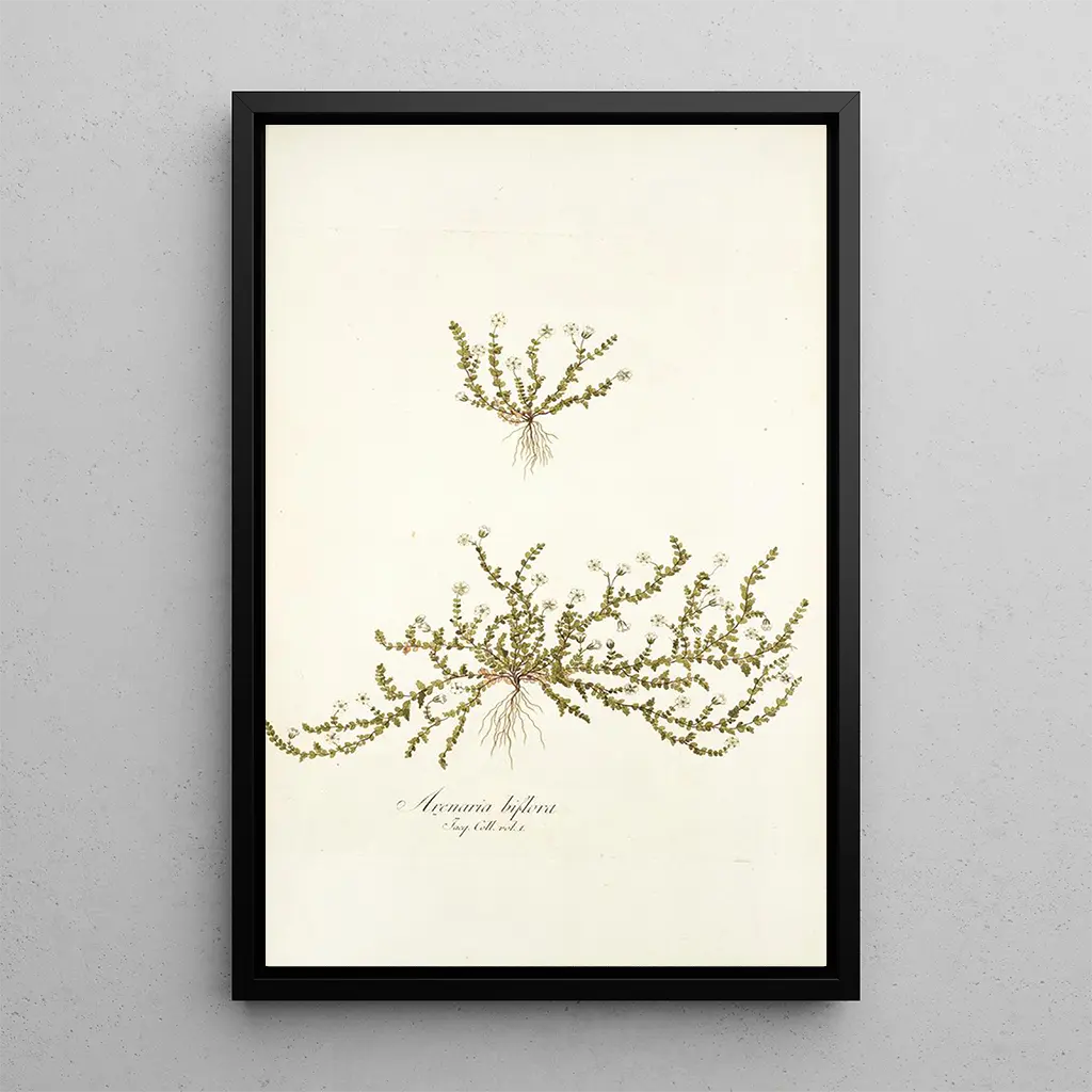 Arenaria biflora : en hyllning till alpina naturen Konsttrycket av Arenaria biflora, verk av Nikolaus Joseph Freiherr von Jacquin, för oss till höjderna i bergen, där denna sällsynta växt blommar. Med en palett av delikata färger, från ren vit till nyanser av grönt, framkallar denna målning friskheten i de alpina landskapen. Tekniken med akvarell, behärskad av Jacquin, möjliggör att fånga lättheten och transparensen hos blommornas kronblad, vilket skapar en eterisk atmosfär. Varje detalj är noggrant observerad, vilket avslöjar den sköra skönheten hos denna art. Detta verk inbjuder till eftertanke och förundran inför naturen. Nikolaus Joseph Freiherr von Jacquin : en konstnär i vetenskapens tjänst Nikolaus Joseph Freiherr von Jacquin, österrikisk botanist och konstnär från 1700-talet, satte sitt avtryck på sin tid genom sina bidrag till botanik och konst. Hans resor gjorde det möjligt för honom att upptäcka många växtarter, som han sedan dokumenterade med ett anmärkningsvärt detaljfokus. Påverkad av de vetenskapliga strömningarna i sin tid, lyckades Jacquin kombinera noggrannhet och kreativitet, vilket gjorde hans verk till referenser inom botanisk illustration. Konsttrycket av Arenaria biflora illustrerar hans talang perfekt, genom att förena vetenskaplig precision med raffinerad estetik. En dekorativ förvärvning med många fördelar Konsttrycket av Arenaria biflora är ett dekorativt föremål som kommer att berika ditt hem, oavsett om det är i ett vardagsrum, ett kontor eller ett sovrum. Dess utskriftskvalitet garanterar en exceptionell trohet mot detaljerna i det ursprungliga verket, vilket gör det möjligt att fullt ut uppskatta Jacquins talang. Den estetiska attraktionen hos denna målning ligger i dess förmåga att tillföra en touch av natur och lugn till din inredning. Genom att välja detta konsttryck lägger du inte bara till ett konstverk i ditt utrymme, utan bjuder också in världens skönhet i din vardag.