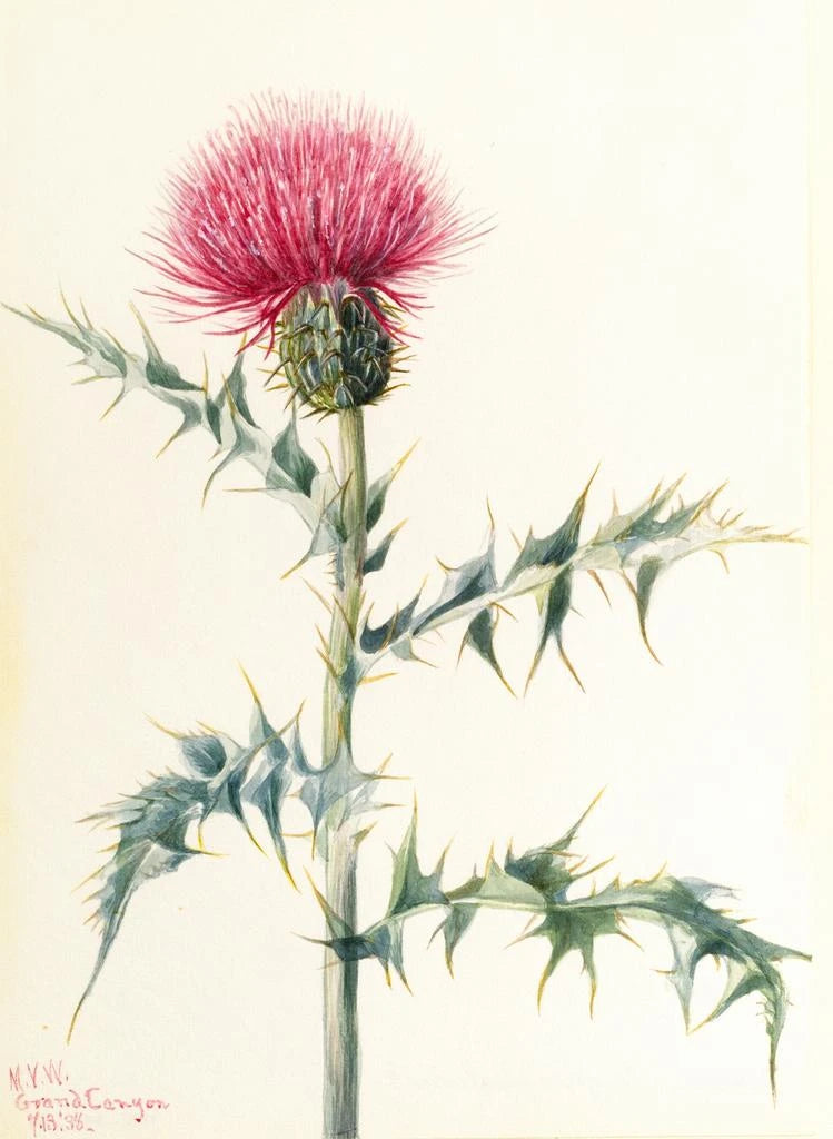 Mary Vaux Walcott, botanist och konstnär, spelade en avgörande roll i dokumentationen av den nordamerikanska floran i början av 1900-talet. Hennes unika stil, som förenar vetenskaplig precision med konstnärlig känslighet, har gjort det möjligt att upptäcka ofta okända arter. "Chardon de l'Arizona" är ett av hennes många verk som vittnar om hennes engagemang för naturen och bevarandet. Påverkad av de konstnärliga rörelserna under sin tid, lyckades Walcott skapa en bro mellan konst och vetenskap och lämna ett varaktigt arv inom botanisk illustration.