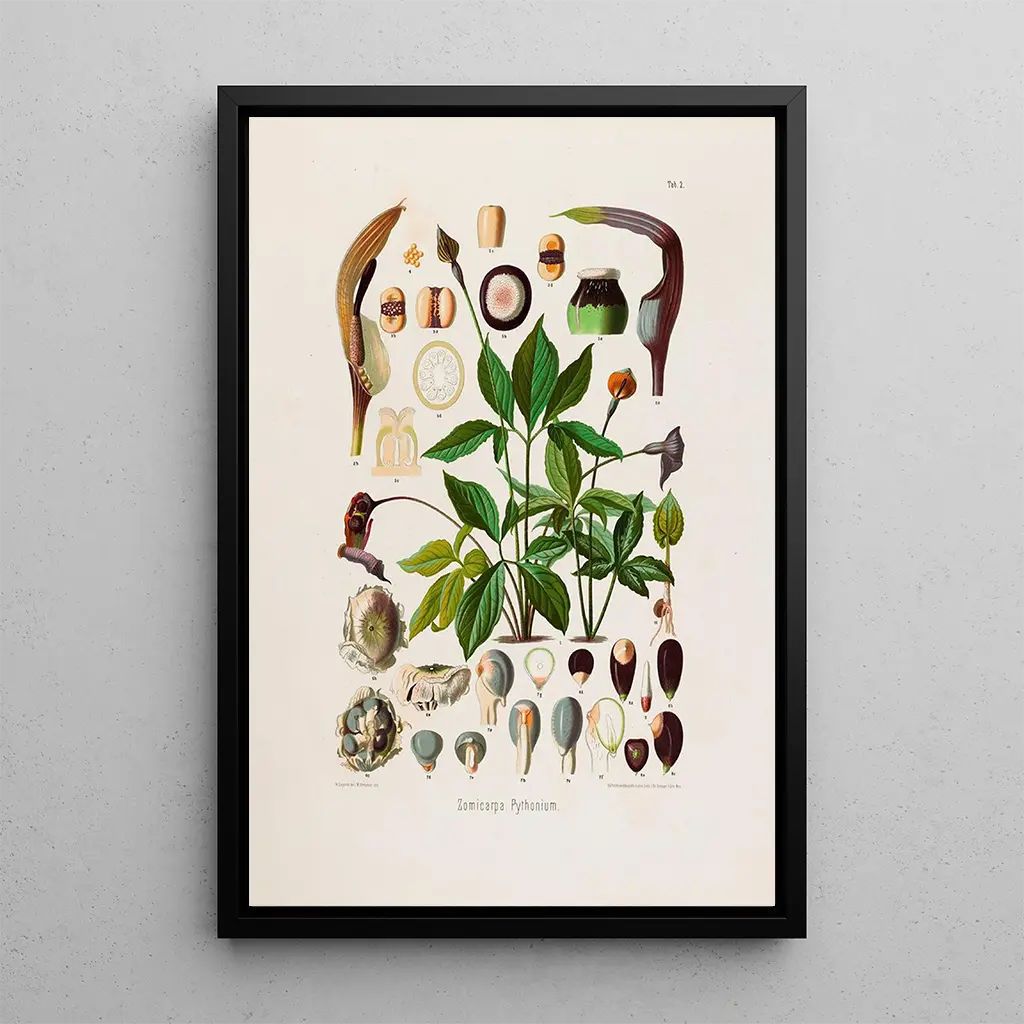 Aroideae Maximilianae Pl02 : en hyllning till den frodiga naturen Konsttrycket Aroideae Maximilianae Pl02 är en verklig hyllning till den växtliga biodiversiteten. Denna tavla, rik på detaljer, fångar essensen av Aroideae med en enastående precision. De livfulla färgerna, som sträcker sig från djupa gröna till glänsande nyanser av gult och rött, framkallar en tropisk atmosfär, nästan hypnotisk. Konstnärens teknik, som blandar akvarell och botanisk teckning, gör det möjligt att återge varje blad och varje stjälk med en oöverträffad finhet. Verket bjuder in betraktaren att fördjupa sig i en värld där naturen regerar, där varje element verkar berätta en historia. Heinrich Wilhelm Schott : pionjär inom konstnärlig botanik Heinrich Wilhelm Schott, botanist och illustratör från 1800-talet, är erkänd för sina betydande bidrag till studiet av tropiska växter. Aktiv under en period då botanisk utforskning var som mest intensiv, lyckades Schott kombinera vetenskap och konst, och skapa verk som är både informativa och estetiska. Påverkad av de vetenskapliga upptäckter som gjordes under hans tid, ägnade han sitt liv åt att illustrera sällsynta växter, särskilt de från familjen Aroideae. Hans arbete har inte bara berikat den botaniska kunskapen, utan också lämnat ett varaktigt arv inom botanisk konst, vilket gör honom till en oumbärlig figur i sin tid. En dekorativ förvärv med många fördelar Konsttrycket Aroideae Maximilianae Pl02 är ett perfekt val för att försköna olika levnadsutrymmen. Oavsett om det är i ett modernt vardagsrum, ett elegant kontor eller ett lugnt sovrum, kommer denna tavla att tillföra en frisk och exotisk touch. Dess utskriftskvalitet garanterar en trohet mot färger och detaljer i originalverket, vilket gör att du kan njuta fullt ut av dess estetiska attraktion. Genom att integrera denna väggbonad i din inredning, inte bara lägger du till ett konstverk, utan du bjuder också in naturens skönhet i din vardag, och skapar en lugn och inspirerande atmosfär.