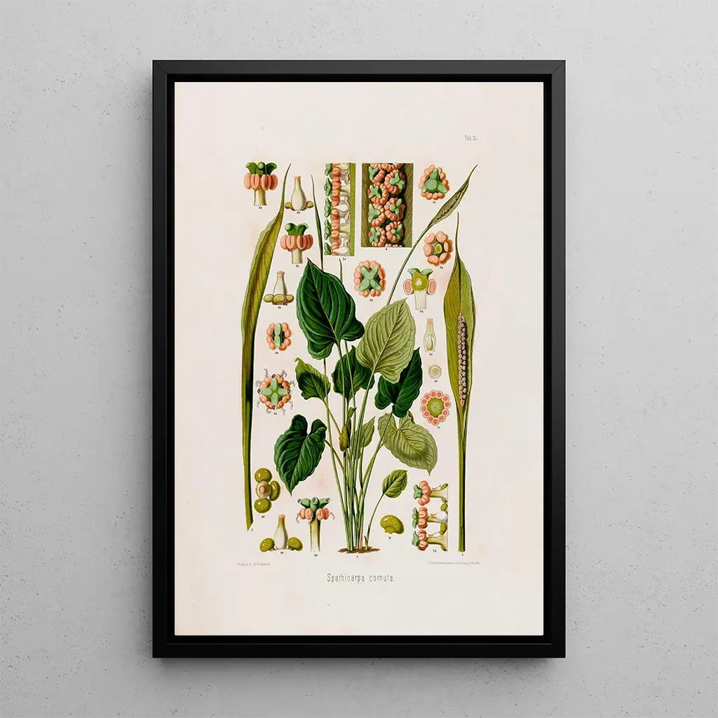Aroideae Maximilianae Pl15 : en dans av former och färger L'œuvre "Aroideae Maximilianae Pl15" av Heinrich Wilhelm Schott utspelar sig som en verklig hyllning till naturen. De livfulla nyanserna av grönt, gult och lila flätas samman för att ge liv åt denna fascinerande växt. Detaljernas precision, typisk för botaniska illustrationer, gör det möjligt att beundra varje nerv på bladen och blomningens delikata elegans. Atmosfären som utstrålas av detta konsttryck är både lugnande och stimulerande, vilket inbjuder betraktaren att fördjupa sig i den frodiga världen av tropisk flora. Varje element är noggrant framhävt, vilket skapar en visuell harmoni som fängslar ögat. Heinrich Wilhelm Schott : en pionjär inom botanisk illustration Heinrich Wilhelm Schott, botanist och illustratör från 1800-talet, ägnade sitt liv åt att studera tropiska växter, särskilt familjerna av Aroideae. Hans arbete påverkades av de botaniska upptäcktsresorna under hans tid, präglade av en önskan att klassificera och förstå biodiversiteten. Schott bidrog inte bara till botanisk vetenskap, utan lyckades också fånga skönheten hos växter genom sina illustrationer. Hans arv består, eftersom hans verk fortsätter att inspirera botanikkunniga och konstälskare. "Aroideae Maximilianae Pl15" är ett perfekt exempel på hans talang, som förenar vetenskaplig noggrannhet med konstnärlig känsla. En dekorativ acquisition med många fördelar Konsttrycket "Aroideae Maximilianae Pl15" är ett dekorativt föremål som kan berika alla utrymmen, oavsett om det är ett vardagsrum, ett kontor eller ett sovrum. Dess tryckkvalitet garanterar en trohet mot färger och detaljer i det ursprungliga verket, vilket gör detta konsttryck till en verklig blickfångare. Den estetiska attraktionen hos denna botaniska illustration tillför en touch av natur och elegans till ditt hem. Genom att välja detta konsttryck, väljer du en dekoration som framkallar skönheten i den naturliga världen samtidigt som den tillför en konstnärlig dimension till din omgivning.