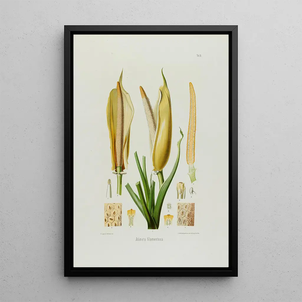 "Aroideae Maximilianae Pl20" av Heinrich Wilhelm Schott är ett konsttryck som hyllar den tropiska växtlighetens rikedom och mångfald. Skiftningarna av grönt, gult och lila blandas harmoniskt och skapar en livfull och dynamisk atmosfär. Detaljernas precision, typisk för litografin, framhäver bladens och blommornas skönhet och bjuder in betraktaren att fördjupa sig i en fascinerande botanisk värld. Detta konsttryck är mycket mer än en enkel illustration; det är ett fönster mot naturen som väcker nyfikenhet och förundran.
