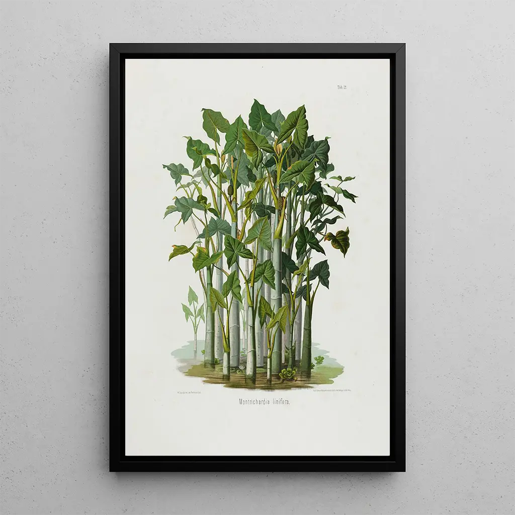 Aroideae Maximilianae Pl21 : en hyllning till den botaniska mångfalden I detta konsttryck av Aroideae Maximilianae Pl21 flätas formernas och färgernas rikedom samman för att skapa en fängslande komposition. Skiftningarna i grönt, gult och lila blandas harmoniskt och framkallar den tropiska frodigheten. Graveringstekniken som Heinrich Wilhelm Schott använde gör det möjligt att återge varje detalj av blad och blommor med en anmärkningsvärt precision. Atmosfären som utstrålar från detta verk är både lugnande och stimulerande, och inbjuder betraktaren att fördjupa sig i den fascinerande världen av exotiska växter. Heinrich Wilhelm Schott : en pionjär inom konstnärlig botanik Heinrich Wilhelm Schott, botanist och illustratör från 1800-talet, lyckades förena vetenskap och konst i sina verk. Utbildad vid Wiens universitet, påverkades han av de botaniska expeditionerna under sin tid, särskilt i tropiska regioner. Schott ägnade sitt liv åt att studera Aroideae, en fascinerande växtfamilj, och publicerade flera illustrerade verk som satte avtryck i sin tid. Hans arbete är avgörande för förståelsen av den växtliga biodiversiteten och fortsätter att inspirera botanister och samtida konstnärer. En dekorativ tillgång med många fördelar Konsttrycket av Aroideae Maximilianae Pl21 är ett perfekt dekorativt föremål för att berika ditt hem, oavsett om det är i vardagsrummet, på kontoret eller i sovrummet. Dess tryckkvalitet och trohet mot originaldetaljer gör det till ett attraktivt val för botanikkonstälskare och konstälskare. Upphängd på väggen ger denna canvas en touch av elegans och friskhet, samtidigt som den väcker intresse och nyfikenhet hos besökarna. Med en perfekt blandning av skönhet och kunskap är detta konstverk ett värdefullt tillskott till varje samling av botanisk konst.