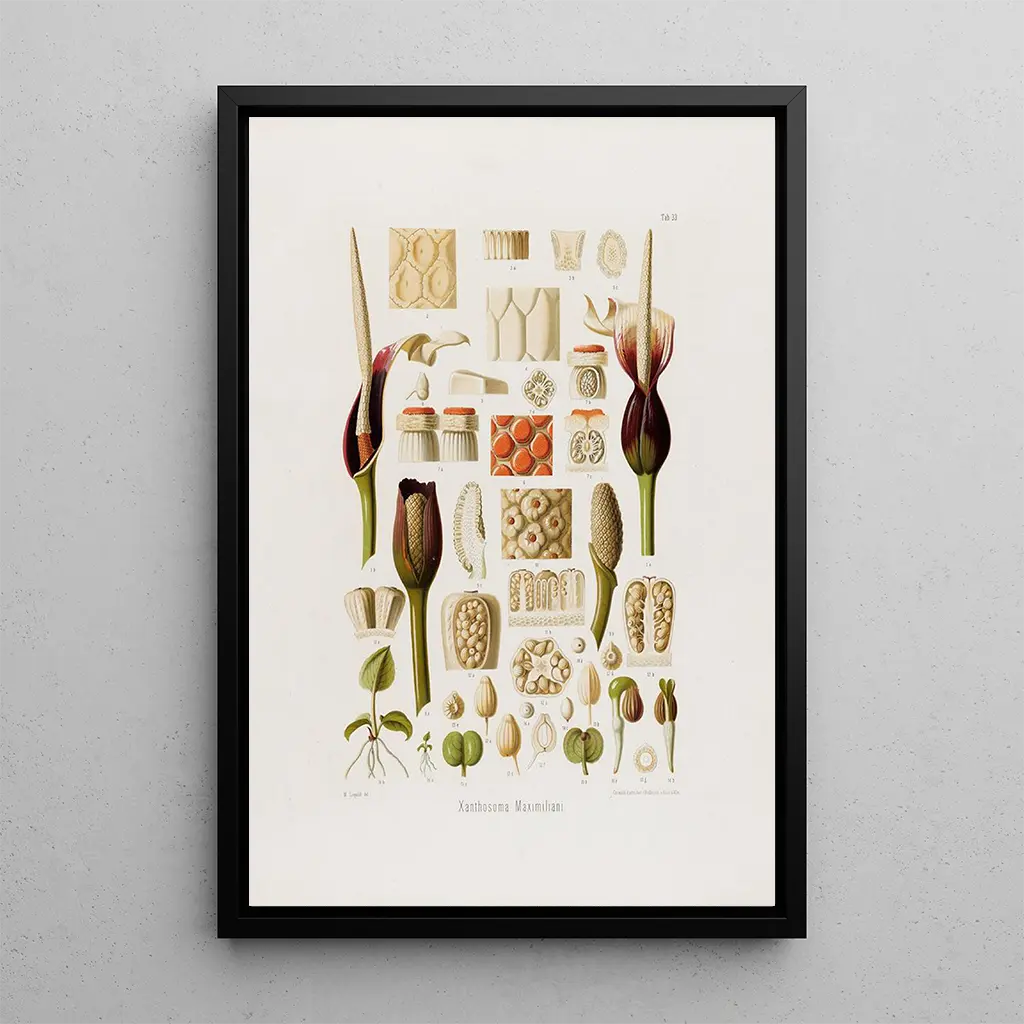Aroideae Maximilianae Pl33 : en hyllning till den frodiga naturen L'œuvre "Aroideae Maximilianae Pl33" av Heinrich Wilhelm Schott fördjupar oss i en fascinerande botanisk värld. Denna konsttryck framhäver en växt med en unik skönhet, med noggranna detaljer som avslöjar komplexiteten i dess blad och blommor. De livfulla färgerna, från djupa gröna till glänsande nyanser, skapar en livlig och dynamisk atmosfär. Den graveringsteknik som Schott använder möjliggör att fånga inte bara växtens fysiska utseende, utan även dess essens, vilket inbjuder betraktaren att uppskatta biodiversitetens rikedom. Varje element i denna målning tycks andas liv och för oss till en frodig trädgård. Heinrich Wilhelm Schott : en pionjär inom konstnärlig botanik Heinrich Wilhelm Schott, botanist och illustratör från 1800-talet, spelade en avgörande roll i dokumentationen av växtarter. Aktiv under en period då vetenskaplig utforskning var i full blom, påverkades Schott av de botaniska upptäckterna i sin tid, särskilt de tropiska växternas. Hans konstnärliga verk präglas av en noggrann och detaljerad stil, som speglar hans engagemang för vetenskap och konst. Som medlem av den vetenskapliga gemenskapen bidrog han till klassificeringen av växter, samtidigt som han gjorde dem tillgängliga för allmänheten genom sina illustrationer. "Aroideae Maximilianae Pl33" vittnar om hans talang och hängivenhet till naturens skönhet. En dekorativ konsttryck med många fördelar Detta konsttryck "Aroideae Maximilianae Pl33" är ett perfekt dekorativt föremål för olika utrymmen, oavsett om det är ett vardagsrum, ett kontor eller ett sovrum. Dess tryckkvalitet garanterar en anmärkningsvärt trogen återgivning av detaljerna i originalverket, vilket ger en obestridlig estetisk attraktion. Genom att integrera detta konsttryck i din inredning tillför du en touch av natur och elegans till ditt hem. Nyansen av grönt och de delikata mönstren av växten skapar en lugnande atmosfär, samtidigt som de väcker beundran hos besökare. Detta konsttryck är mycket mer än bara en dekoration; det är en inbjudan till eftertanke och uppskattning av naturens skönhet.