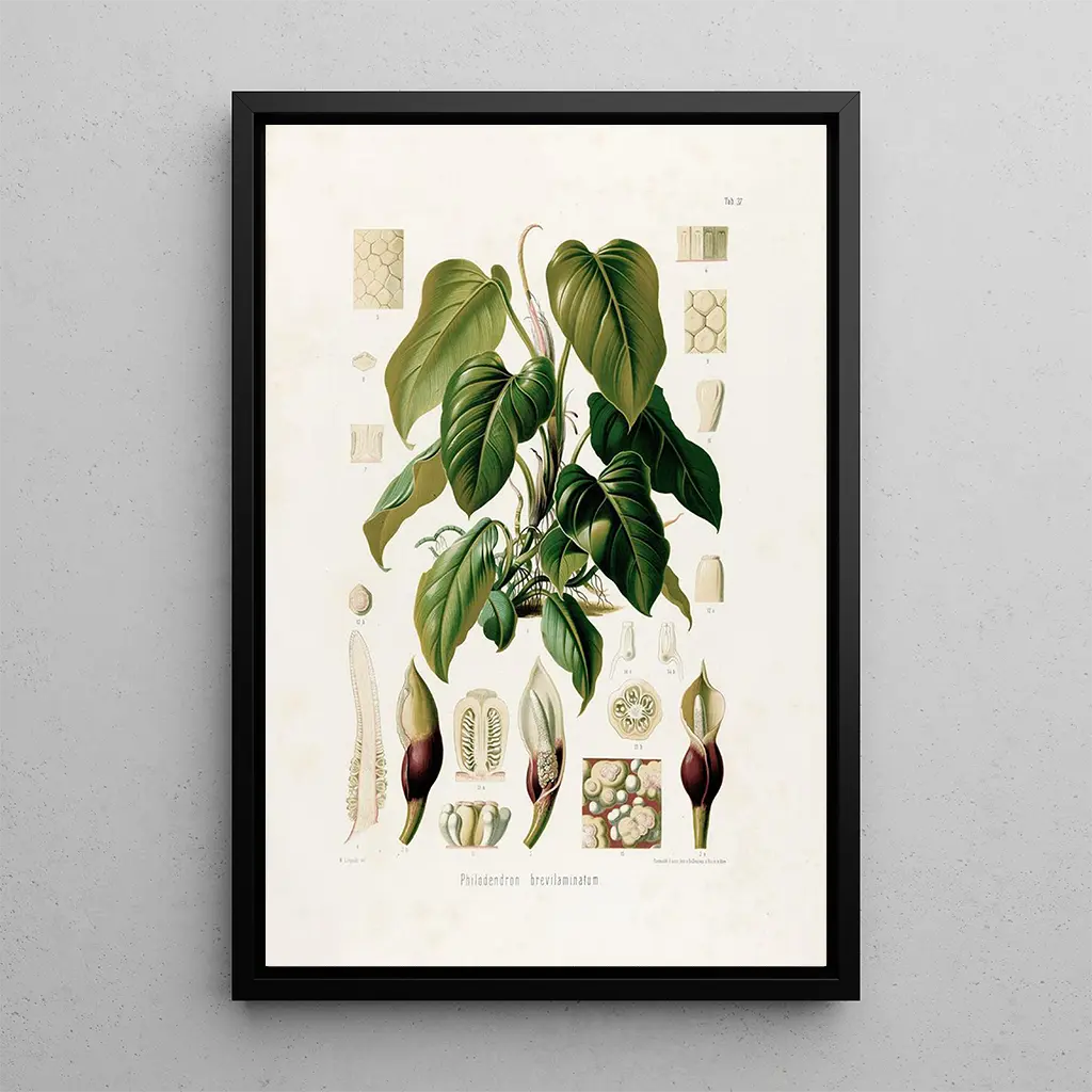 Konsttrycket Aroideae Maximilianae Pl37 är ett verk som lyfter fram den fascinerande mångfalden av aroides. Med sina delikata nyanser av grönt och sina rika texturer bjuder detta konsttryck in till en visuell utforskning av organiska former. Graveringstekniken som används av Heinrich Wilhelm Schott gör det möjligt att återge varje detalj med enastående precision, vilket skapar en atmosfär som är både lugn och livfull. Verket tycks fånga ett ögonblick som är svävande i tiden, där naturens skönhet uttrycks i all sin prakt.
