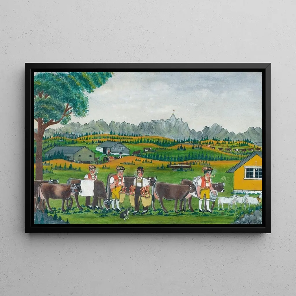 Arrivée à l'alpage : une ode à la nature alpine "Arrivée à l'alpage", œuvre de Johannes Rechsteiner, évoque la beauté majestueuse des paysages alpins. Ce tableau capture un moment de sérénité où les personnages, entourés de montagnes imposantes, semblent en harmonie avec la nature. Les teintes douces de vert et de bleu, associées à des touches de lumière dorée, créent une atmosphère paisible et contemplative. La technique de Rechsteiner, marquée par une attention minutieuse aux détails, permet de ressentir la fraîcheur de l'air alpin et la tranquillité du cadre, invitant le spectateur à s'évader dans cet environnement idyllique. Johannes Rechsteiner : un peintre des paysages suisses Johannes Rechsteiner, artiste suisse du XIXe siècle, est connu pour ses paysages alpins qui reflètent son amour pour la nature. Influencé par le romantisme, il a su capturer la majesté des montagnes suisses avec une sensibilité unique. Sa carrière, bien que moins connue que celle de certains de ses contemporains, a été marquée par une volonté de représenter la beauté naturelle de son pays. Rechsteiner a contribué à l'émergence d'une identité nationale à travers l'art, mettant en avant les paysages suisses comme symbole de fierté et d'esthétique. Une acquisition décorative aux multiples atouts La reproduction de "Arrivée à l'alpage" est un choix décoratif parfait pour ceux qui souhaitent apporter une touche de nature à leur intérieur. Que ce soit dans un salon, un bureau ou une chambre, cette toile offre une qualité d'impression exceptionnelle et une fidélité à l'œuvre originale qui séduira tous les amateurs d'art. Son attrait esthétique, associé à la sérénité qu'elle dégage, transforme n'importe quel espace en un havre de paix. En intégrant cette œuvre dans votre décoration, vous invitez la beauté des Alpes suisses chez vous, créant ainsi une atmosphère apaisante et inspirante.