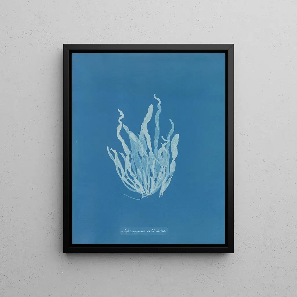 Anna Atkins stil utmärker sig genom sin unika metod för botanisk fotografi. Med cyanotypitekniken skapar hon impressioner med en imponerande intensitet och klarhet. "Asperococcus echinatus" utmärker sig genom sina nyanser av djupt blått, som både påminner om havet och himlen, samtidigt som den framhäver algarnas delikata textur. Konsttrycket nöjer sig inte med att avbilda ett motiv; det framkallar en atmosfär, en känsla av förundran inför naturen. De organiska formerna av alger, återgivna med minutiös precision, tycks nästan dansa på papperet och erbjuder en immersiv visuell upplevelse. Denna fusion av vetenskap och konst ger konsttrycket en unikhet som placerar det i korsningen mellan estetik och lärdom.
