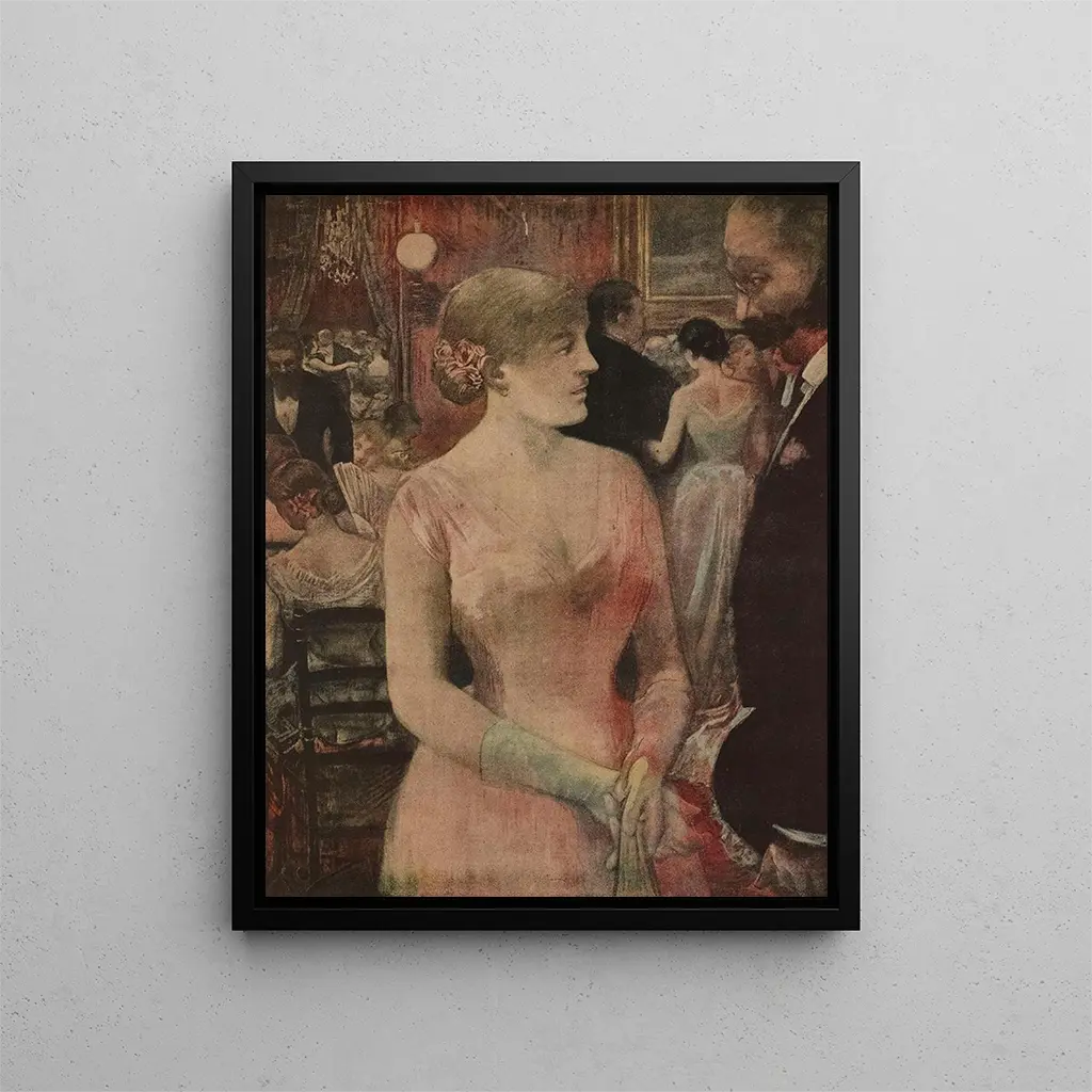 L'œuvre "Au bal" förkroppsligar elegans och livfullhet i danskvällar från en svunnen tid. Denna tavla, anonym, lyckas fånga själva essensen av baler, där musik och dans blandas med en festlig och vänskaplig atmosfär. Genom en palett av livfulla färger och graciösa rörelser fördjupar konstnären oss i en värld där varje karaktär verkar berätta en historia, och bjuder in betraktaren att känna pulsen av dessa privilegierade ögonblick. Scenen skildrar oss till en värld av förfining, där storslagna kostymer och strålande ansikten möts, och avslöjar ett samhälle i full blomstring.
