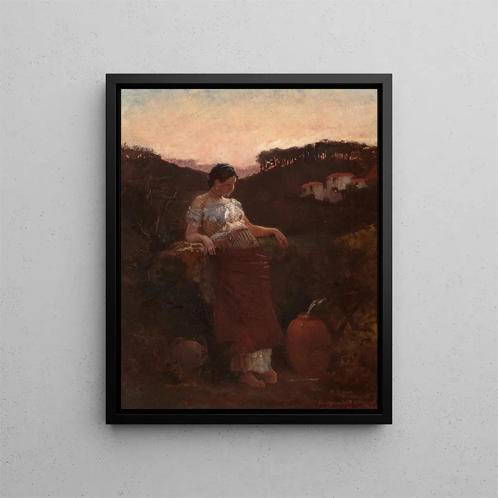 Edwin Howland Blashfield, född 1848, är en konstnär vars arbete starkt påverkats av pre-rafaelitiska rörelsen och amerikansk realism. Hans karriär, präglad av en ständig strävan efter skönhet och sanning, vittnar om en vilja att höja det vardagliga till en nivå av visuell poesi. Blashfield har lyckats etablera sig som en mästare på fresker, men det är i hans målningar man verkligen kan uppfatta hans talang för att fånga ögonblick av grace. Hans inflytande sträcker sig bortom hans egna verk och inspirerar många samtida konstnärer att utforska förhållandet mellan människa och miljö. "Vid brunnen" är en perfekt illustration av denna strävan, där varje penseldrag tycks resonera med en djup förståelse för den mänskliga tillståndet.