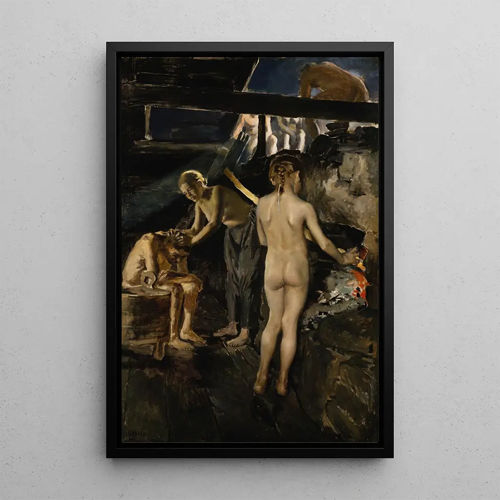 "Au Sauna" är ett ikoniskt konsttryck av Akseli Gallen-Kallela som fångar essensen av en djupt förankrad finsk tradition. Tavlan föreställer mänskliga figurer i ett bastu, omgivna av ånga och värme, vilket skapar en atmosfär av gemenskap och rening. De varma och jordnära färgerna, kombinerade med nyanser av blått, skapar en slående kontrast som drar till sig blickar. Gallen-Kallelas teknik, som blandar realism och impressionism, gör det möjligt att känna värmen och intimiteten i detta heliga rum. Detta konsttryck är en sann hyllning till den finska kulturen och dess ritualer, och bjuder in till en unik sensorisk upplevelse.