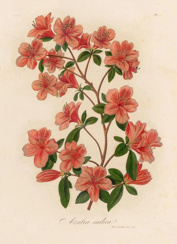 L'Azalea indica, med sina livfulla kronblad och sin frodiga blomning, framkallar en trädgård i full aktivitet. Detta konsttryck, som fångar naturens flyktiga skönhet, utmärker sig genom sina strålande nyanser av rosa, rött och vitt. Konstnärens teknik, som kombinerar akvarell och teckning, skapar en finstämd och poetisk atmosfär, inbjudande betraktaren att fördjupa sig i en förtrollande blomstervärld. Varje detalj, från blad till blommor, återges med en precision som vittnar om noggrann observation och en passion för motivet.