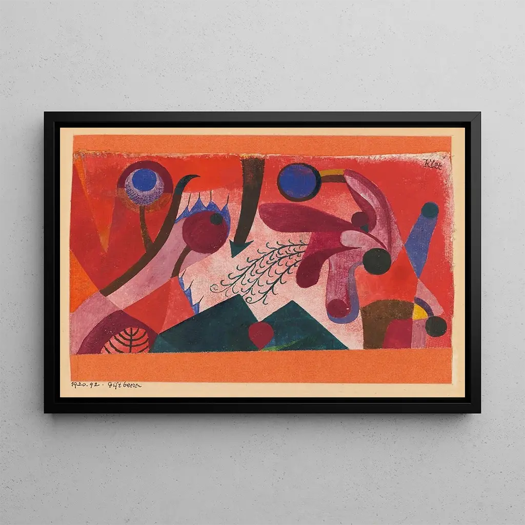Paul Klee, artiste suisse né en 1879, est reconnu pour son approche unique de la couleur et de la forme. Influencé par le cubisme, l'expressionnisme et l'art populaire, Klee a su développer un style distinctif qui transcende les frontières artistiques. Actif durant la première moitié du XXe siècle, il a été membre du Bauhaus, où il a expérimenté avec la théorie des couleurs et la pédagogie artistique. Ses œuvres, souvent empreintes de poésie et de mystère, reflètent une profonde compréhension de l'âme humaine et de la nature. Cette reproduction de "Baies vénéneuses" témoigne de son héritage durable dans l'art moderne.