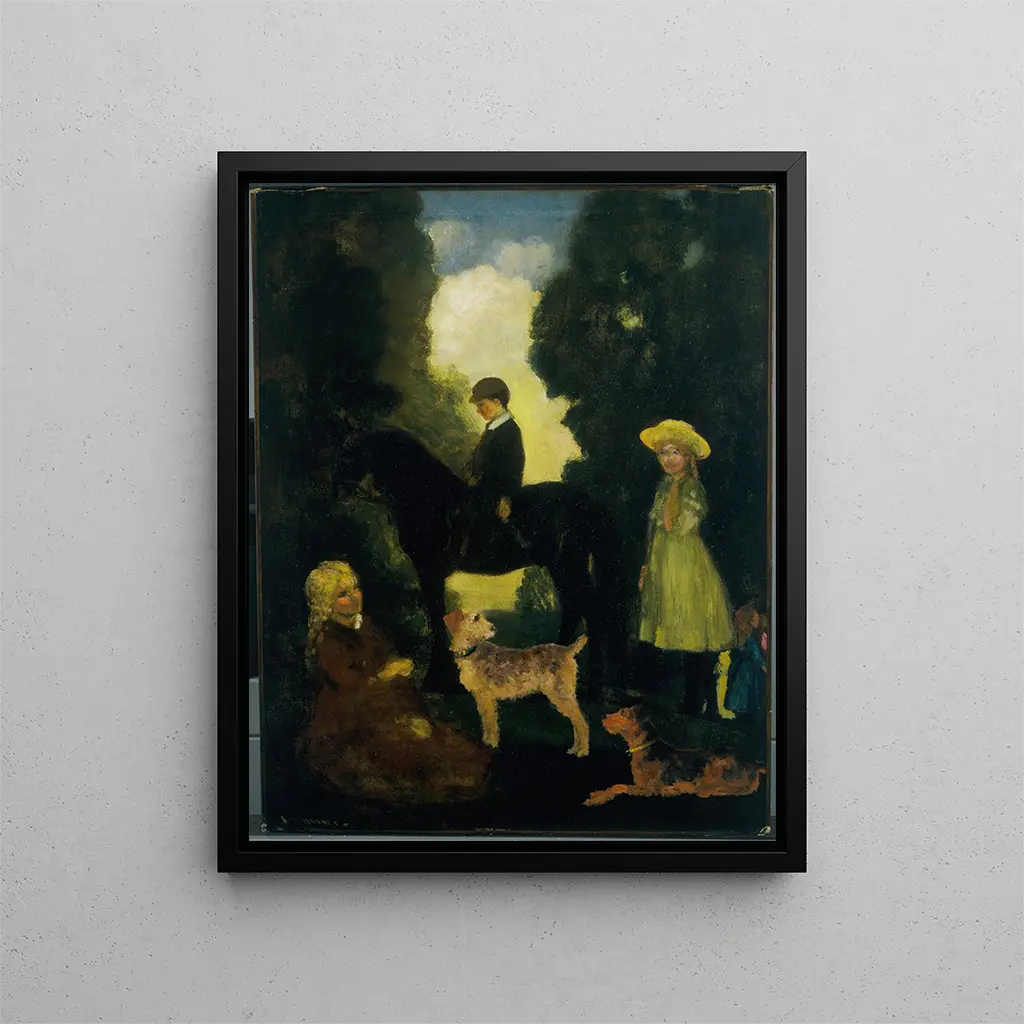 I det stora konsthistoriska panoramat lyckas vissa verk fånga en unik essens, ett ögonblick som hänger mellan dröm och verklighet. "Enfants, hundar och ponnyn - Arthur Bowen Davies" passar perfekt in i denna kategori. Detta verk framkallar en idyllisk scen där barndomens glädje blandas med naturens mildhet. Genom en palett av delikata färger och en harmonisk komposition lyckas Davies transportera betraktaren till en värld fylld av lugn och oskuld. Barnen, omgivna av sina hundkamrater och en ponnyn, verkar blomstra i ett utrymme där tiden står stilla. Denna idylliska skildring inbjuder till eftertanke och flykt, vilket gör verket till ett verkligt levande konstverk.