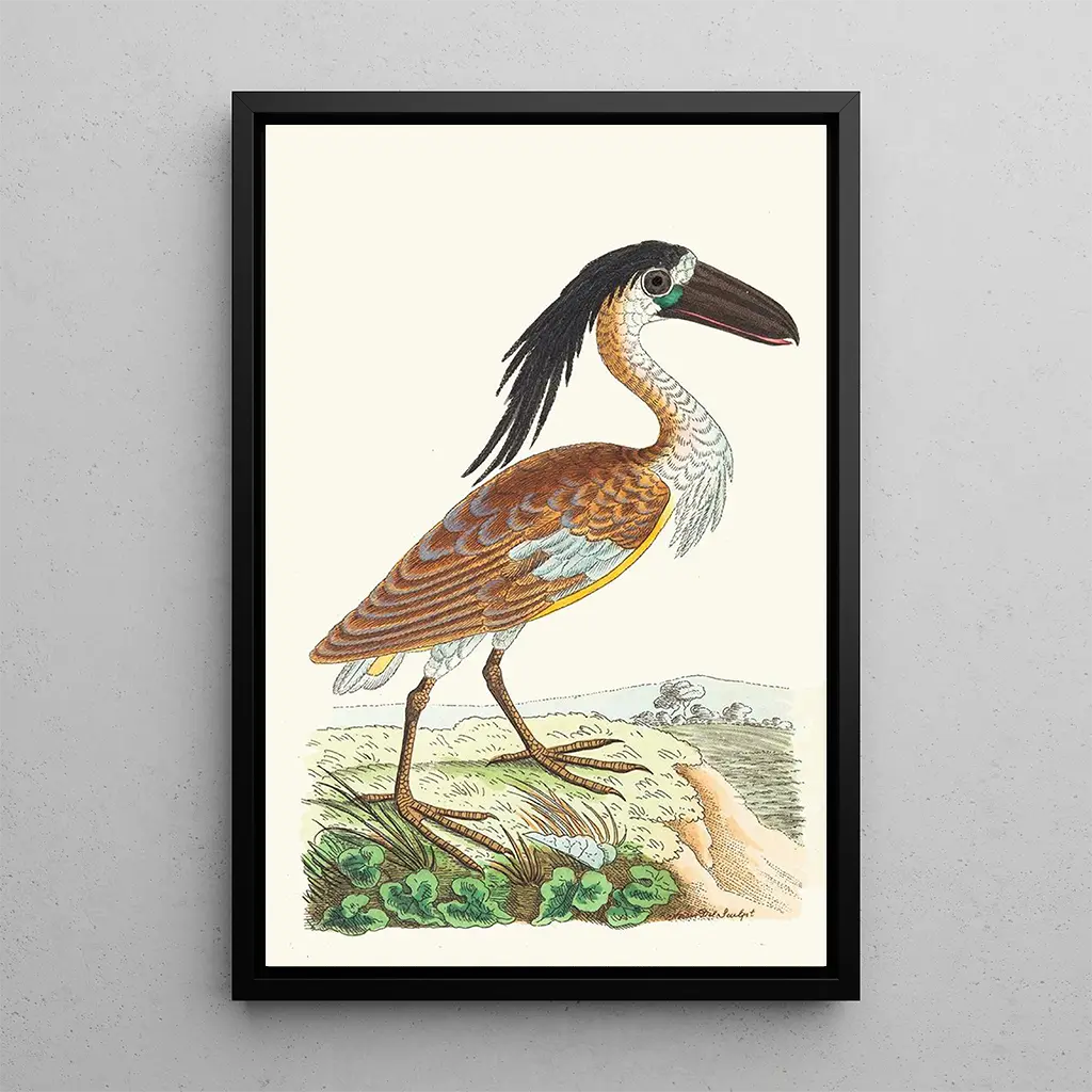Konsttrycket "Bec-en-sabot" av George Shaw fördjupar oss i en värld där naturen uttrycker sig med en sällsynt intensitet. De jordnära färgerna, blandade med nyanser av grönt och blått, skapar en atmosfär som är både lugn och mystisk. Konstnärens teknik, som använder lager av färg för att ge liv åt sina motiv, gör det möjligt att känna texturen och djupet i varje element. Detta bec-en-sabot, majestätiskt och gåtfullt, tycks ta liv framför våra ögon och inbjuder till en förlängd eftertanke. Verket framkallar en finstämd harmoni mellan djuret och dess omgivning, en hyllning till den vilda skönheten.