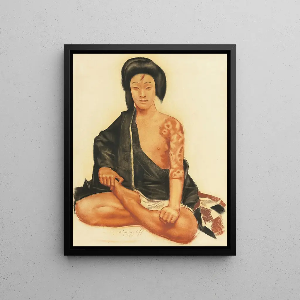 Reproduktionen av Benten Kozo Kikunosuke - Alexandre Iacovleff är ett verk som förflyttar betraktaren till en värld rik på färger och känslor. Den ingår i den konstnärliga traditionen från början av 1900-talet, där Orienten och Västerlandet möts och sammanflätas. Detta stycke, samtidigt delikat och djärvt, väcker teman om skönhet, mysterium och kultur. Genom detta verk nöjer sig inte Alexandre Iacovleff med att skildra en karaktär, han skapar en dialog mellan kulturer, en inbjudan att utforska den mänskliga själens djup. Verket står som en bro mellan två världar och erbjuder ett unikt perspektiv på identitet och existens.