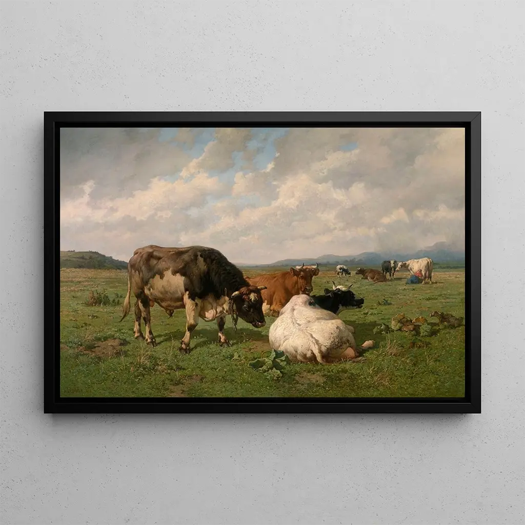 Dans cette reproduction de Bétail dans le pré, Louis Robbe nous transporte au cœur d'un paysage pastoral où la nature s'épanouit. Les teintes douces et lumineuses évoquent la lumière du jour, tandis que les animaux paisibles se mêlent harmonieusement à la verdure environnante. La technique de Robbe, qui allie réalisme et impressionnisme, crée une atmosphère apaisante, presque méditative. Chaque détail, des reflets dans l'eau aux ombres des arbres, contribue à une composition équilibrée qui invite à la contemplation et à l'évasion.