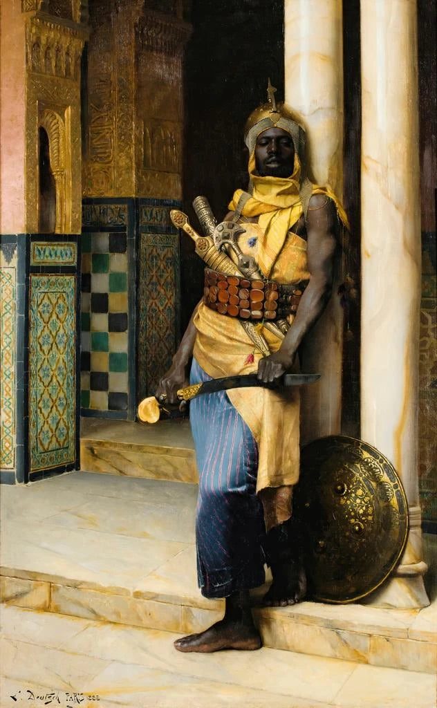 Dans "Gardant le palais", Ludwig Deutsch nous offre une vision apaisante d'un gardien en méditation, veillant sur un majestueux palais oriental. La composition est soigneusement équilibrée, mettant en avant le personnage central tout en intégrant des éléments architecturaux qui évoquent la grandeur et l'harmonie. Les teintes douces et les jeux de lumière créent une atmosphère sereine, presque contemplative. La technique de Deutsch, qui allie précision et sensibilité, permet de ressentir la tranquillité du moment, transportant le spectateur dans un univers où le temps semble suspendu.
