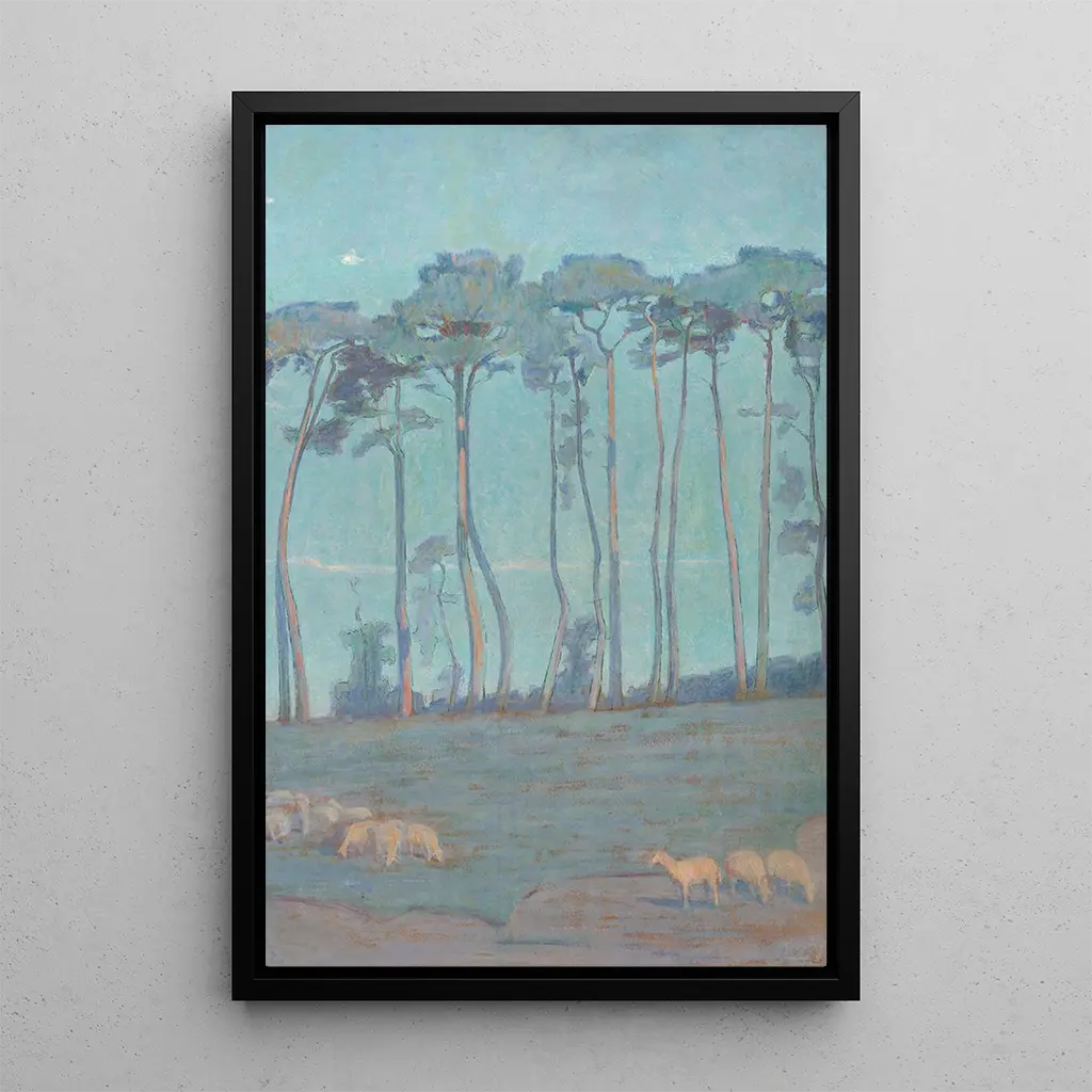 I detta fängslande konsttryck, målningen "Paysage bleu aux moutons" av Henri Rivière för oss till en fridfull värld där naturen uttrycker sig med glans. De blå nyanser dominerar konstverket, vilket framkallar en vidsträckt och lugnande himmel, medan fåren, varsamt placerade, tillför en levande touch till detta idylliska landskap. Rivières teknik, som kombinerar akvarell och impressionism, ger hela verket en lätt och drömmande atmosfär, inbjudande till eftertanke. Varje penseldrag verkar fånga sötman i ett avstängt ögonblick, där tiden står stilla för att lämna plats åt den naturliga världens skönhet.