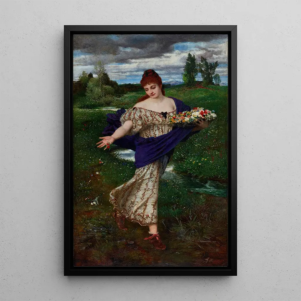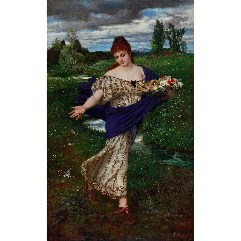 I "Flore dispersant des fleurs" ger Arnold Böcklin oss en poetisk vision av blomsterfröjdens gudinna, som förkroppsligar naturens skönhet och generositet. Pastellfärgerna, mjuka och ljusa, framkallar en evig vår, medan den centrala figuren, omgiven av strålande blommor, tycks dansa med grace. Böcklins teknik, som förenar realism och mytologiska element, skapar en lätt och glad atmosfär. Varje kronblad, varje rörelse är en inbjudan att fira livet och skönheten, vilket gör detta konsttryck till en sann hyllning till naturen och dess rikedom.
