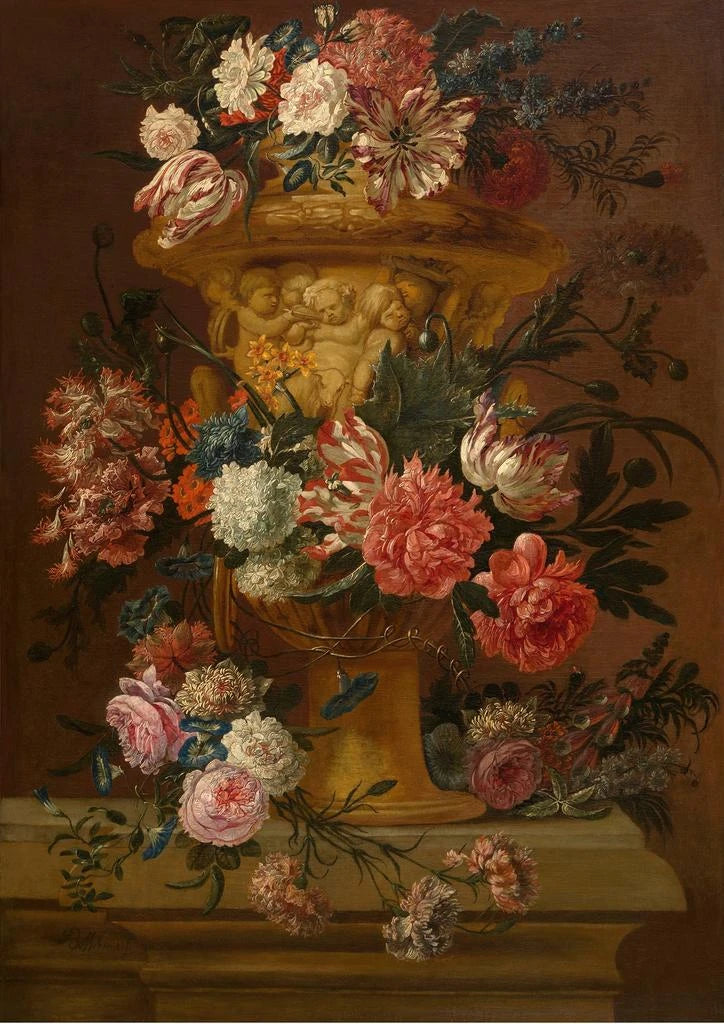 Jan Baptist Bosschaert, verksam i början av 1600-talet, är erkänd som en av mästarna inom stilla livet-genren. Påverkad av flamländska traditioner har han utvecklat en distinkt stil som förenar realism och poesi. Bosschaert utbildades i en konstnärlig miljö rik på inspiration, där han umgicks med andra stora namn från sin tid. Hans verk, ofta kännetecknade av frodiga blomsterkompositioner, vittnar om hans skicklighet att leka med ljus och texturer. Som konstnär har han bidragit till genreutvecklingen genom att integrera symboliska element och utforska naturens flyktiga skönhet.
