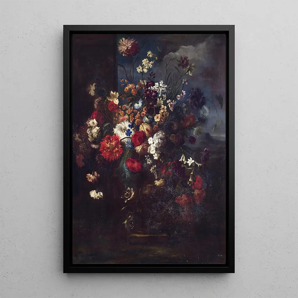 Konsttrycket av Komposition florale är ett perfekt val för att försköna ditt hem, oavsett om det är i ett vardagsrum, ett kontor eller ett sovrum. Dess utskriftskvalitet garanterar en enastående trohet mot färger och detaljer i originalet, och tillför en känsla av friskhet och vitalitet till din inredning. Denna tavla, med sin estetiska dragningskraft, inbjuder till eftertanke och lugn. Genom att lägga till denna duk i ditt utrymme skapar du en varm och välkomnande atmosfär, samtidigt som du hyllar blomsterkonsten av en mästare från 1800-talet.
