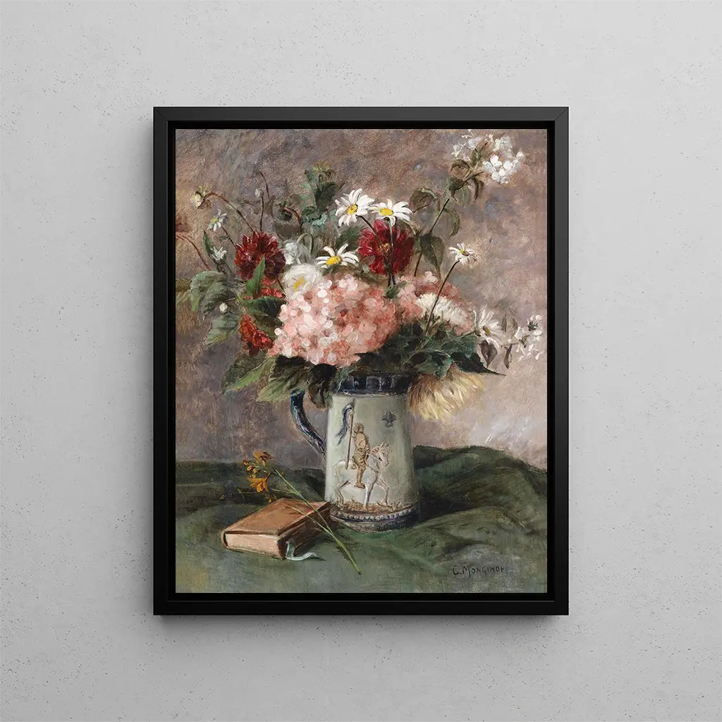 Särprägeln hos "Konsttryck composition florale avec livre" ligger i Charles Monginots tekniska skicklighet, som lyckas fånga ljuset och färgerna med en anmärkningsvärt finstämdhet. Blommorna, målade med en nästan fotografisk noggrannhet, tycks vibrera under en mjuk ljusstråle, medan boken, även om den är sekundär i kompositionen, tillför ett narrativ djup till verket. De delikata nyanserna av kronblad och de subtila skuggorna skapar en intim atmosfär, där varje element i målningen verkar berätta en historia. Kombinationen av blommor och bok symboliserar också en balans mellan det flyktiga och det bestående, mellan den naturliga skönheten och sökandet efter kunskap. Detta verk är en hyllning till livets rikedom, en firande av de små saker som omger oss och som när våra sinnen.