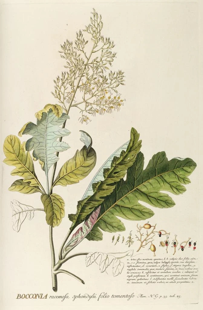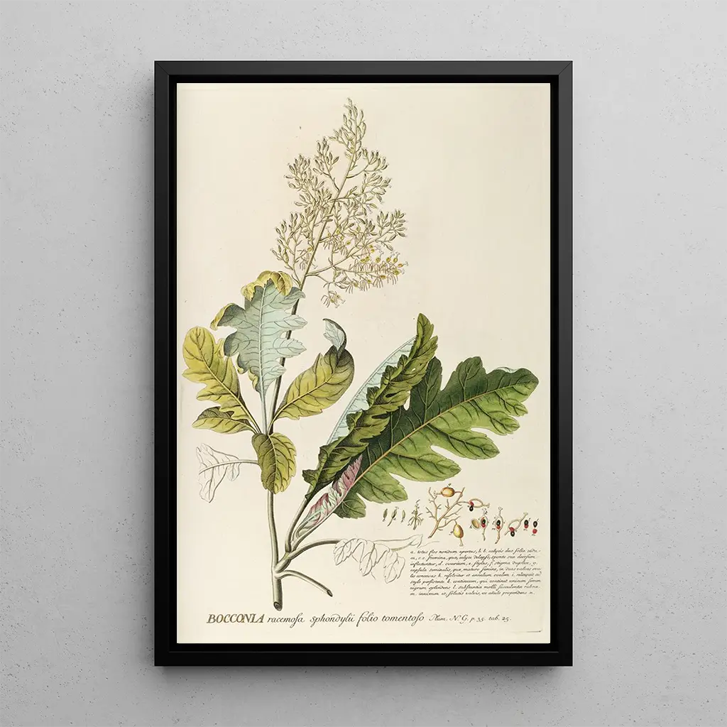 Konsttrycket av Bocconia är ett perfekt dekorativt föremål för att försköna ditt hem, oavsett om det är i ett vardagsrum, ett kontor eller ett sovrum. Dess utskriftskvalitet och trohet mot det ursprungliga verket gör det till ett utmärkt val för konst- och botanikkännare. Med sin obestridliga estetiska attraktion ger denna väggbonad en känsla av friskhet och lugn till vilket utrymme som helst. Den erbjuder ett fönster till naturens skönhet och kommer att tilltala dina gäster samt berika din inredning med elegans.