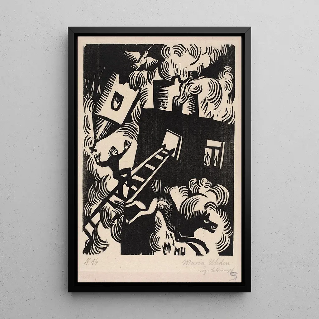 La konsttryck av verket "Maison en feu" av Maria Uhden framkallar en scen med en slående intensitet. De livfulla färgerna och de tydliga kontrasten illustrerar kaos och förstörelse, samtidigt som de fångar betraktarens uppmärksamhet. Den måleriteknik som Uhden använder, som blandar realism och expressionism, skapar en atmosfär som är både oroande och fascinerande. Flammorna dansar med en påtaglig energi, medan skuggorna tillför en dramatisk djup till kompositionen. Detta verk inbjuder till reflektion över teman som förlust och motståndskraft, samtidigt som det erbjuder en minnesvärd visuell upplevelse.