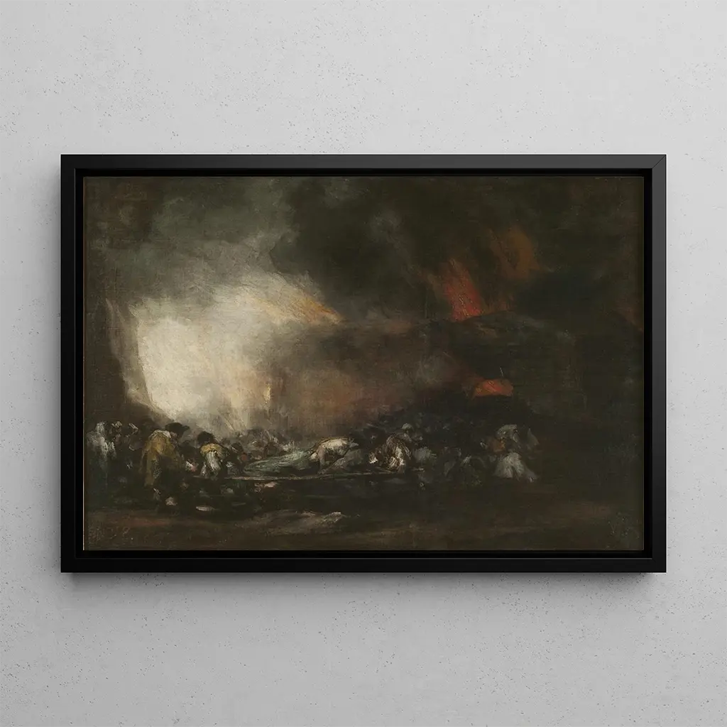Dans cette œuvre marquante, Francisco de Goya dépeint un moment tragique où un hôpital est ravagé par les flammes. Les couleurs sombres et les coups de pinceau expressifs transmettent une intensité émotionnelle qui plonge le spectateur dans l'horreur de la scène. Les figures humaines, figées dans la douleur et la désespérance, sont mises en avant, créant un contraste saisissant avec le chaos environnant. Goya réussit à capturer non seulement la destruction physique, mais aussi la détresse psychologique des victimes, rendant cette toile profondément émotive et mémorable.