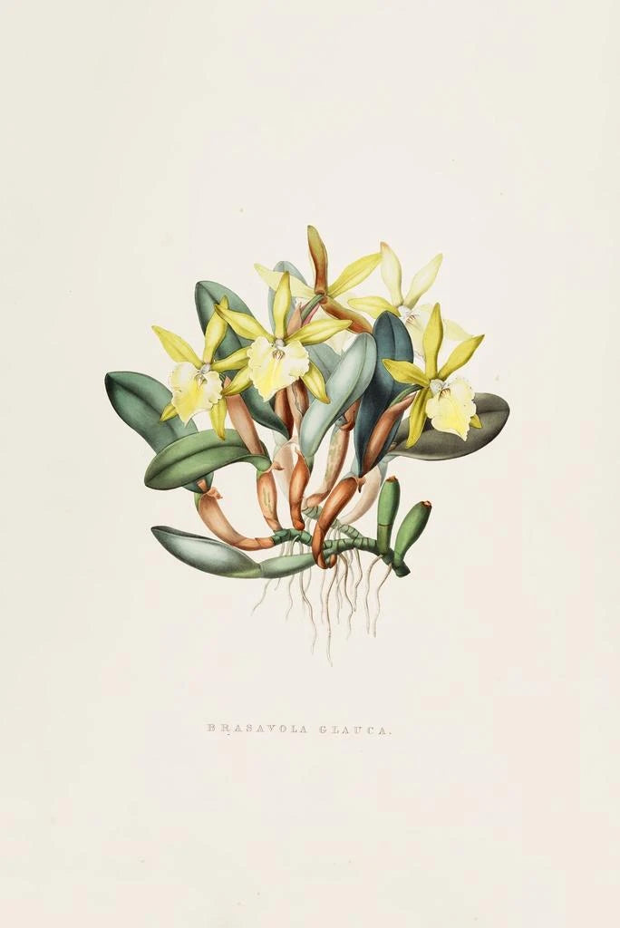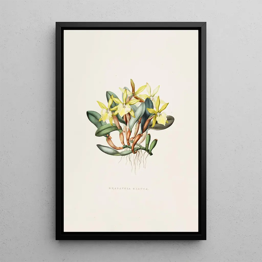 Konsttrycket av Brasavola Glauca framkallar en sällsynt delikatess, som fångar själva essensen av denna fascinerande orkidé. De mjuka nyanserna av vitt och grönt blandas subtilt, vilket skapar en lugnande tavla som inbjuder till flykt. Varje detalj, från kronblad till blad, återges med en anmärkningsvärt precision, vilket vittnar om konstnärens talang. Den måleriteknik som valts av James Bateman ger liv åt denna blomma och ger den en nästan tredimensionell dimension. Atmosfären som utstrålar från denna målning är fylld av lugn, perfekt för dem som söker en touch av naturen i sin vardag.