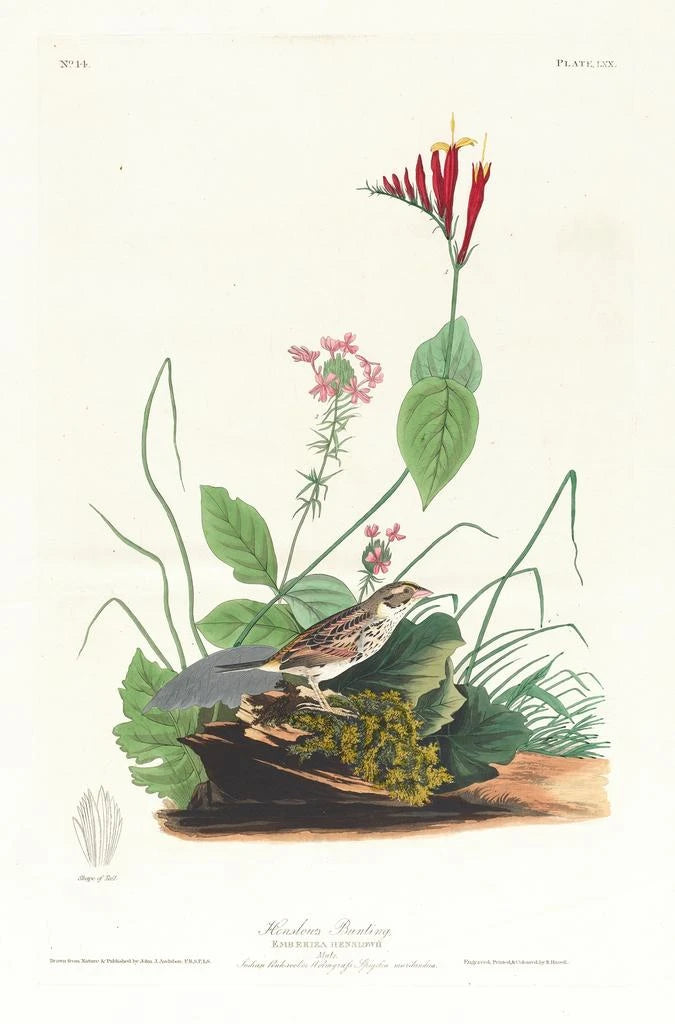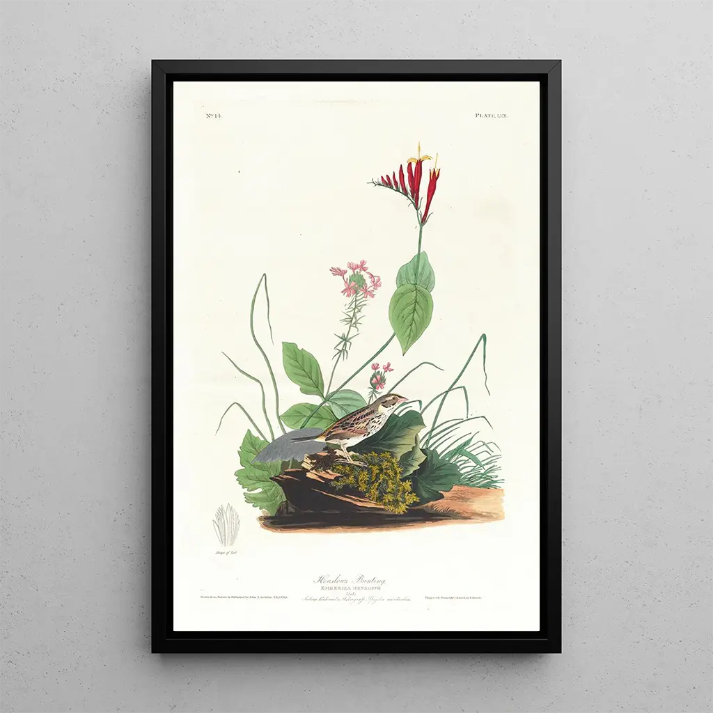 Detta konsttryck av "Bruant de Henslow" av John James Audubon är ett livfullt verk som fångar den delikata skönheten hos denna fågel. Med mjuka och naturliga färger använder konstnären nyanser av grönt, gult och brunt för att skildra fågelns fjäderdräkt, medan bakgrunden framkallar en fridfull miljö, typisk för amerikanska prärrier. Audubons precisa teknik, som kombinerar akvarell och teckning, ger liv åt varje detalj och skapar en atmosfär som är både realistisk och poetisk. Detta verk inbjuder till noggrann eftertanke och avslöjar fågelfaunans grace och skörhet.