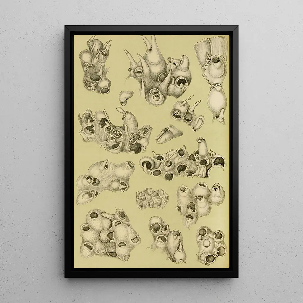 Konsttrycket av Bryozoaires V fördjupar oss i en fascinerande värld, där de organiska formernas elegans blandas med en palett av mjuka och lugnande färger. Frederick McCoy, med en enastående precision, fångar skönheten hos bryozoa, dessa ofta okända marina varelser. De noggranna detaljerna och texturen hos de avbildade elementen skapar en nästan drömlik atmosfär, som inbjuder betraktaren att förundras över den marina livets komplexitet. Varje nyans av färg, från mjuka grönt till varma bruna toner, återspeglar den rika världen under ytan och förvandlar detta konsttryck till en sann hyllning till naturen.