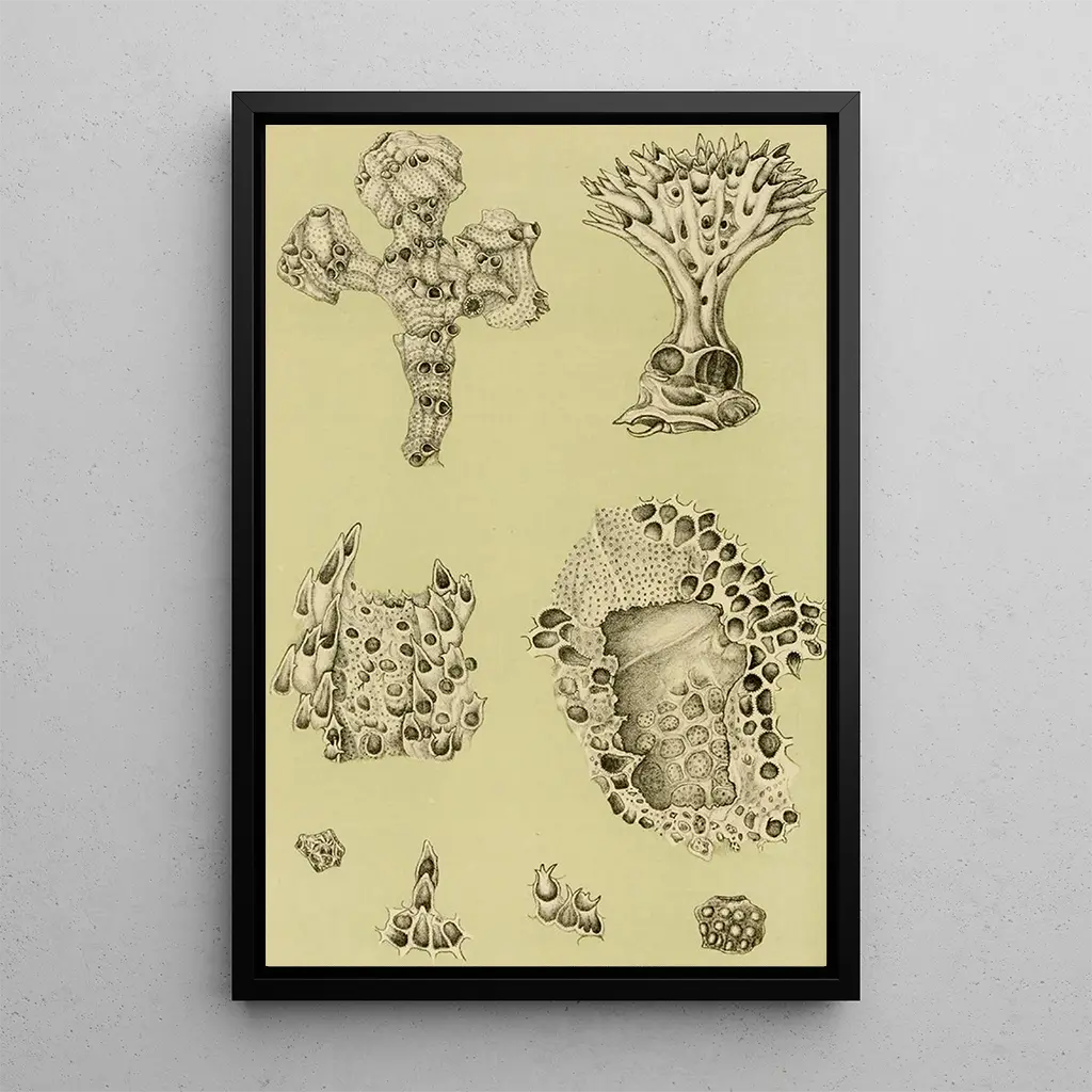 Konsttrycket av Bryozoaires IX bjuder in oss att utforska en undervattensvärld rik på texturer och färger. Detta verk av Frederick McCoy utmärker sig genom sin noggranna skildring av bryozoarer, vilket lyfter fram mångfalden och komplexiteten hos dessa organismer. De delikata nyanserna och de organiska formerna skapar en lugnande atmosfär, som inbjuder till eftertanke. Varje detalj i denna målning vittnar om konstnärens noggranna observation, vilket gör detta konsttryck till en sann hyllning till naturens skönhet.