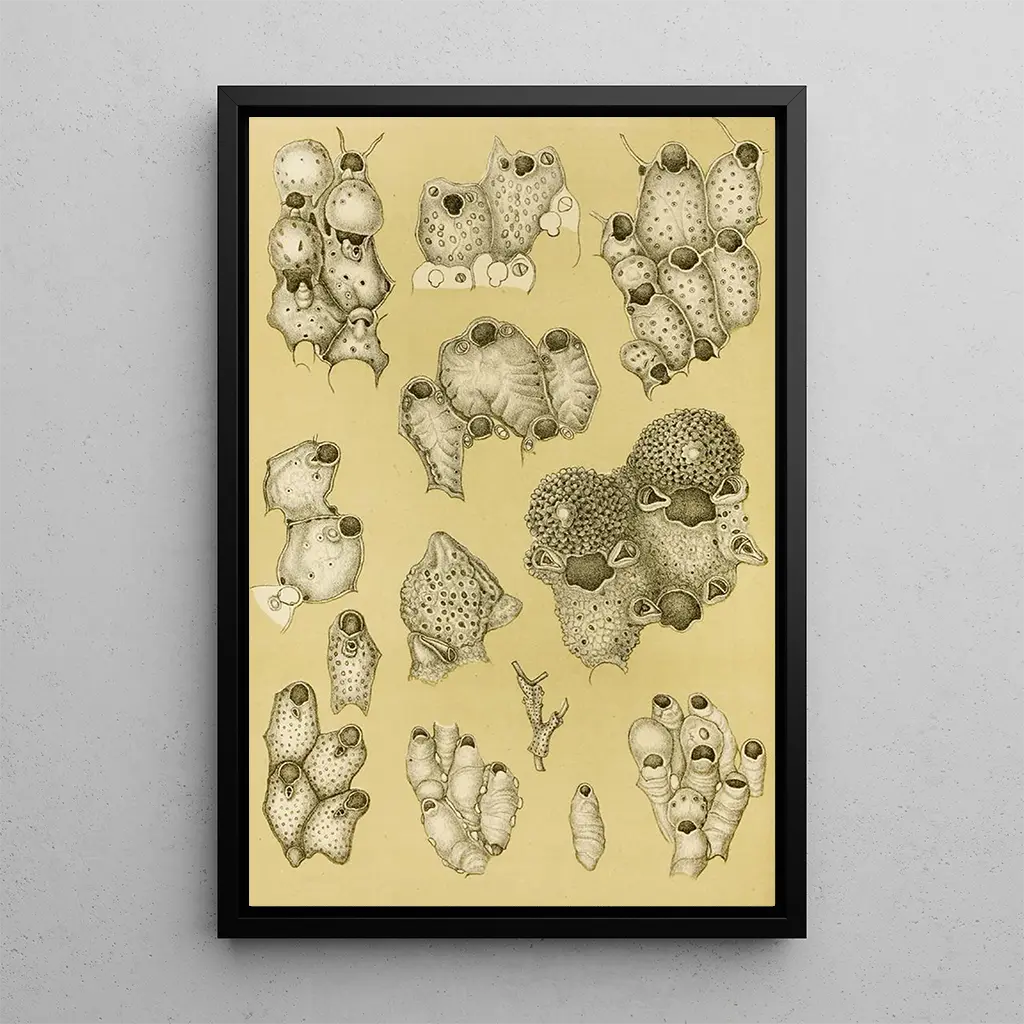 Konsttrycket av Bryozoaires XIV fördjupar oss i en fascinerande värld där naturen avslöjar sig under en konstnärlig dag. De noggrant utarbetade detaljerna av bryozoärer, dessa små marina organismer, framhävs av en palett av delikata färger, som pendlar mellan mjuka nyanser och livfulla toner. Tekniken som används av Frederick McCoy, som förenar vetenskaplig precision med estetisk känsla, skapar en atmosfär som är både lugnande och fängslande. Varje element i denna målning verkar berätta en historia, inbjudande betraktaren att utforska de marina livets djup.