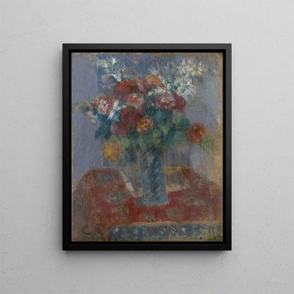 Camille Pissarros stil kännetecknas av ett unikt tillvägagångssätt för ljus och färg. I "Bukett" använder han snabba och vibrerande penseldrag som ger liv åt blommorna, och skapar en atmosfär som är både dynamisk och lugnande. Pastellnyanser, blandade med mer livfulla inslag, framkallar en subtil harmoni som förflyttar betraktaren till en frodig trädgård, där varje blomma tycks dansa under solens strålar. Kompositionen är noggrant balanserad, varje element är placerat med en precision som vittnar om konstnärens talang. Pissarro lyckas fånga inte bara skönheten hos blommorna, utan också själva essensen av naturen, vilket gör detta verk tidlöst och universellt.