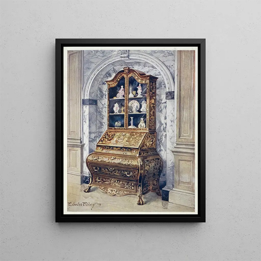 Edwin Foleys bureau bombé förkroppsligar perfekt Louis XV-stilen, känd för sina graciösa kurvor och fin dekor. Detta möbel utmärker sig genom sin sensuella siluett, sina böjda linjer och sitt värdefulla inläggningsarbete. Valnöt, vald för sin värme och djup, förhöjs av delikata mönster som verkar dansa på träets yta. Varje detalj, varje kurva, är resultatet av noggrann uppmärksamhet, vilket avslöjar ett hantverk som transcenderar det enkla föremålet för att bli ett fullvärdigt konstverk. Kombinationen av texturer och färger skapar en atmosfär som är både intim och sofistikerad, vilket gör detta bureau till en central del i vilken som helst interiör.