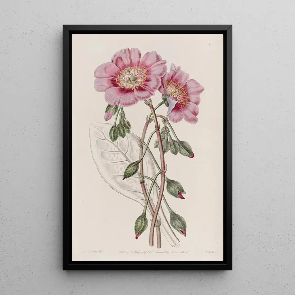 Konsttrycket av Calandrinia decolorata är en verklig hyllning till naturens ömtålighet. Detta verk, med sina subtila nyanser av lila och grönt, framkallar en lugn och kontemplativ atmosfär. Lithografitekniken som används av Sydenham Edwards gör det möjligt att noggrant återge texturer och former av denna växt, vilket skapar en levande tavla. Varje detalj, från blommor till stjälkar, är noggrant framhävd och inbjuder betraktaren att utforska den rika floran. Calandrinia decolorata, även om den är mindre känd, avslöjar en diskret skönhet som förtjänar att hyllas.