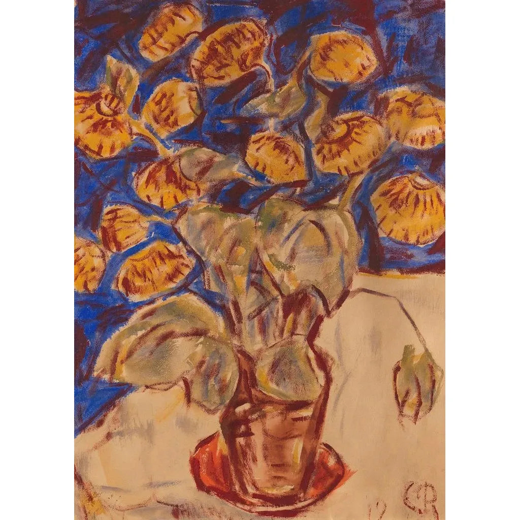 Konsttrycket av Calceolaria av Christian Rohlfs fördjupar oss i en blomstrande värld där de strålande nyanserna flätas samman för att skapa en dynamisk komposition. De rundade formerna av blommorna, nästan skulpturala, tycks dansa på duken, medan nyanser av gult, orange och rött harmoniserar med gröna inslag. Rohlfs teknik, som blandar impressionism och expressionism, ger detta verk en atmosfär som är både glad och kontemplativ. Varje penseldrag tycks fyllt av känsla, inbjudande betraktaren att fördjupa sig i naturens flyktiga skönhet.
