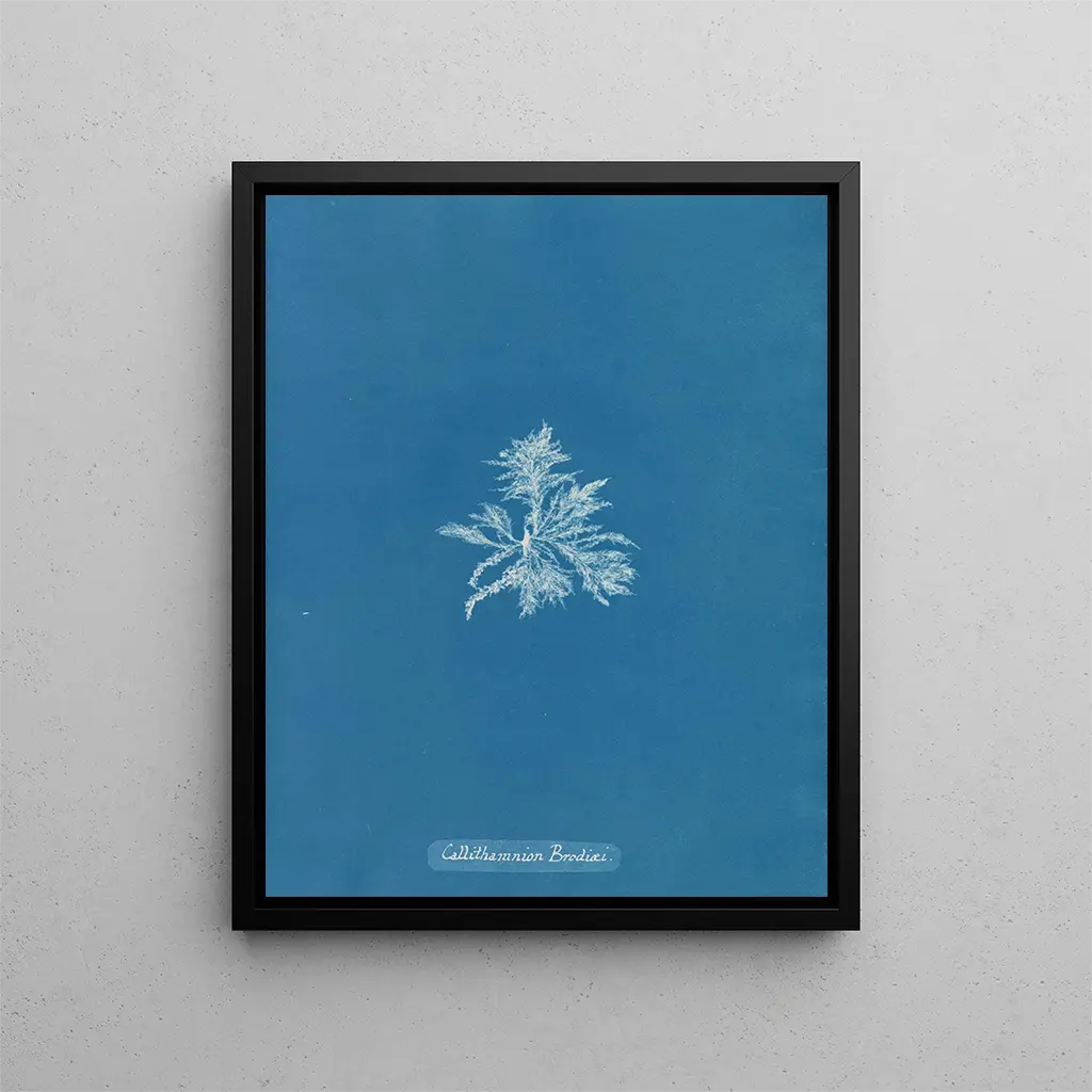 Konsttryck Callithamnion brodii - Anna Atkins utmärker sig genom sin innovativa fotografimetod. Med hjälp av cyanotypetekniken lyckades Atkins skapa impressioner av en sällsynt finhet, där algerna verkar sväva på papperet, som om de just plockats ur vattnet. Den djupblå färgen, som är typisk för denna metod, ger verket en atmosfär som är både lugn och mystisk. Varje alg, varje detalj, framhävs genom en slående kontrast, vilket gör att betraktaren kan uppskatta komplexiteten och skönheten hos dessa ofta försummade organismer. Detta val av framställningssätt vittnar om Atkins beundran för naturen, samtidigt som det understryker hennes engagemang för att dokumentera den marina biologin på ett konstnärligt sätt.