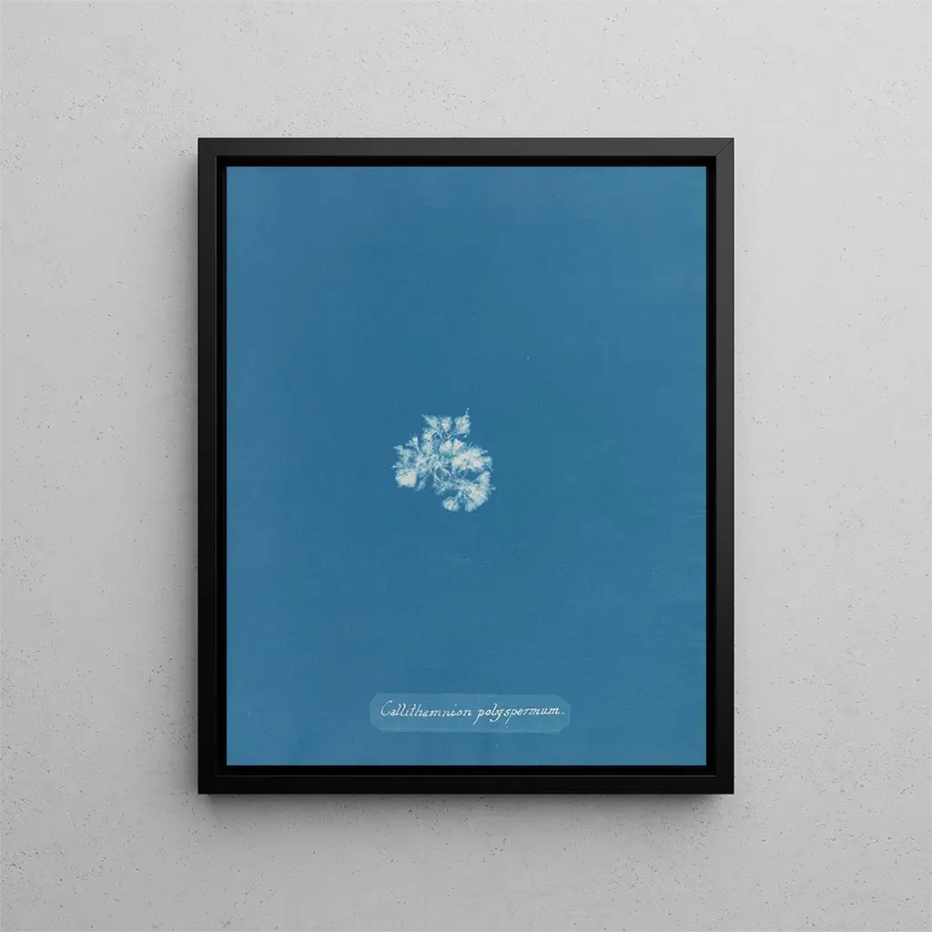 Reproduktion Callithamnion polyspermum - Anna Atkins – Introduktion fängslande I en värld där naturen och konsten möts på ett nytt sätt, utmärker sig verket "Callithamnion polyspermum" av Anna Atkins genom sin delikata skönhet och vetenskapliga precision. Denna ikoniska del, som är en av de första botaniska fotografiska illustrationerna, för oss in i en värld där vetenskap och estetik vävs samman. Genom denna avbildning av alger fångar Atkins inte bara en enkel bild; hon immortaliserar den marina livets skörhet och komplexitet. När man betraktar detta verk bjuds man in att utforska djupen av en ofta okänd värld, där varje detalj berättar en historia. Stil och unikhet i verket Anna Atkins stil präglas av ett innovativt tillvägagångssätt som förenar fotografi och illustration. Verket "Callithamnion polyspermum" kännetecknas av en klarhet och precision som avslöjar en imponerande teknisk skicklighet. Algerna, presenterade med en nästan vetenskaplig noggrannhet, verkar sväva på papperet och ger en känsla av lätthet och transparens. Nyansen av blått och grönt, typisk för den marina världen, ger denna konstverk en lugnande atmosfär samtidigt som den antyder djupet i haven. Atkins använder cyanotypetekniken, en metod för fotografisk tryckning som gör det möjligt för henne att skapa förtrollande bilder där skugga och ljus möts för att ge liv åt organiska former. Detta verk överskrider den enkla avbildningen; det blir en meditation över naturens skönhet och dess förgänglighet. Konstnären och dess inflytande Anna Atkins, pionjär inom botanisk fotografi, banade väg för en ny form av konst som förenar vetenskap och kreativitet. Född 1799 var hon en av de första kvinnorna att göra sig ett namn inom fotografins område, vid en tid då denna praktik fortfarande var i sin linda. Hennes verk, särskilt "Callithamnion polyspermum", vittnar om hennes engagemang för vetenskap och natur. Som botanist bidrog hon till dokumentationen av växtarter, samtidigt som hon använde sin konst för att öka allmänhetens medvetenhet om naturens skönhet och mångfald. Hennes inflytande består än idag, och inspirerar många samtida konstnärer som söker utforska