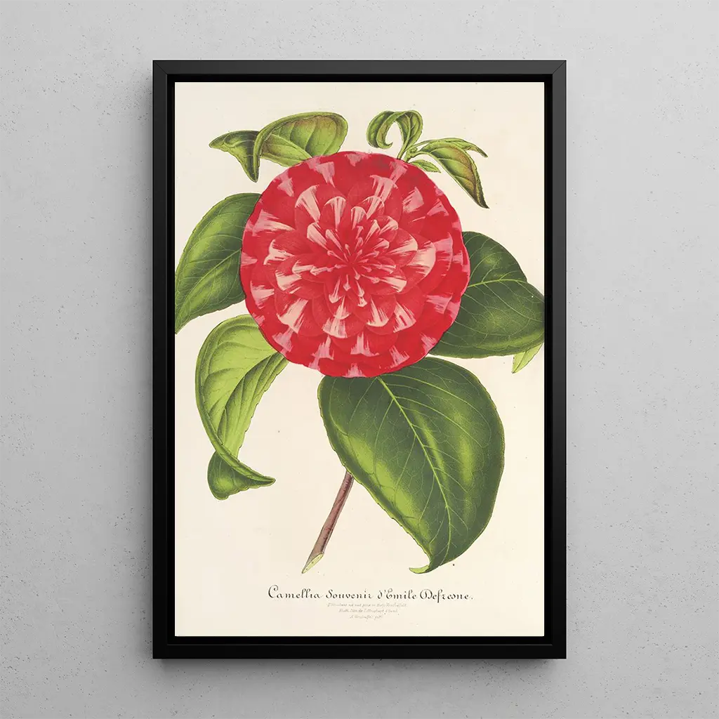 Detta konsttryck av Camellia Souvenir d'Émile Defresne, skapat av Charles Antoine Lemaire, framkallar en slående blomsterprakt. Tavlan, rik på färger och detaljer, visar glänsande kamelior, vars nyanser av rött och rosa smälter samman i harmoni. Lemaire's teknik, som använder flytande och dynamiska penseldrag, skapar en levande och glad atmosfär. Varje blomma tycks vibrera under ljuset, och erbjuder en fängslande visuell upplevelse som förflyttar betraktaren till en frodig trädgård, där naturen blomstrar i all sin prakt.