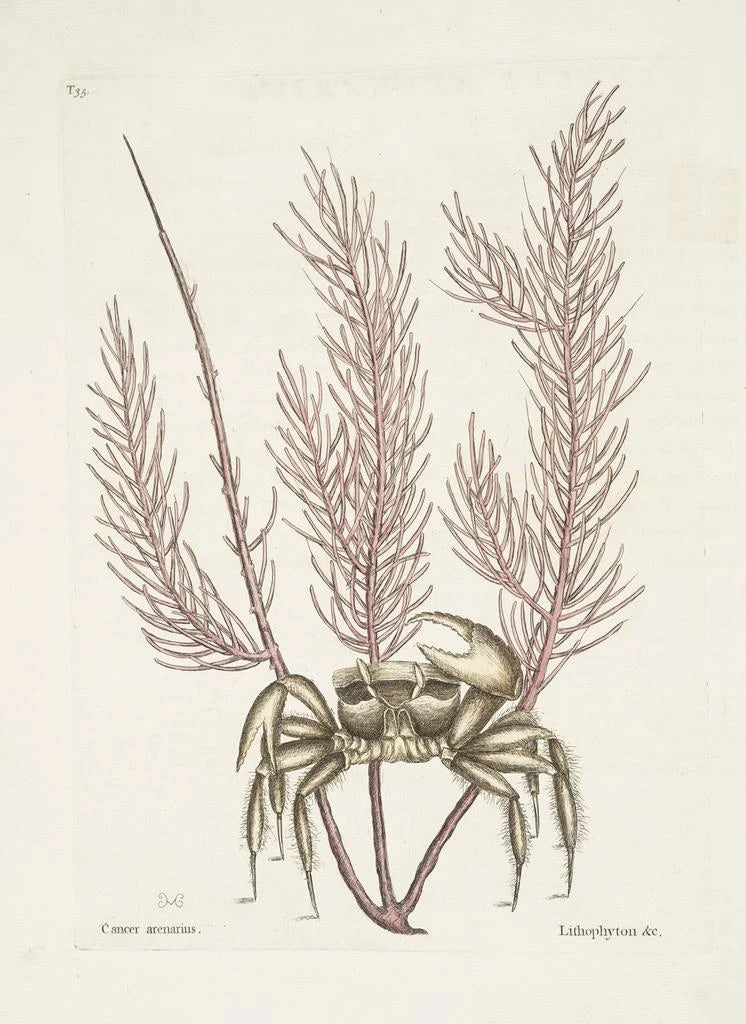 Mark Catesby, naturalist och illustratör från 1700-talet, är erkänd för sina bidrag till studiet av den amerikanska faunan och floran. Hans arbete, influerat av resor i Nordamerika, ingår i rörelsen för vetenskaplig observation som växte fram under denna tid. Catesby lyckades förena konst och vetenskap, och erbjöd precisa och poetiska skildringar av naturen. Hans konsttryck, Cancer arenarius, ingår i en serie illustrationer som vittnar om den rika biodiversiteten, samtidigt som de understryker vikten av att bevara dessa arter.