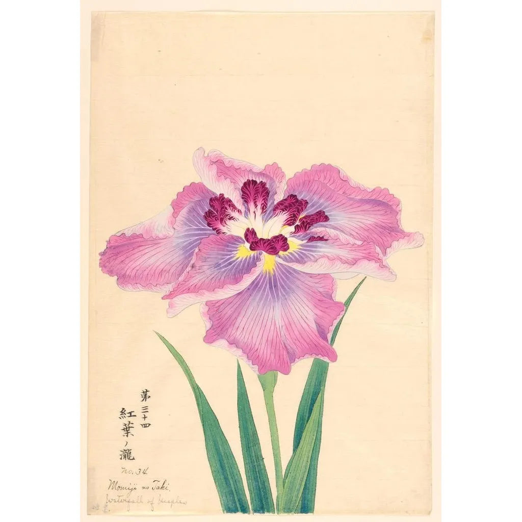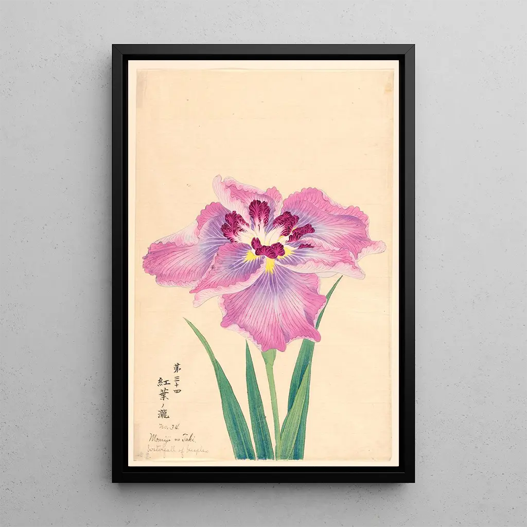 Konsttrycket av Cascade av lönn Momiji no Taki framkallar en lugn scen där naturen klär sig i sina vackraste nyanser. Lönnbladen, i strålande nyanser av rött, orange och gult, speglar sig i det kristallklara vattnet i ett vattenfall. Tekniken för ukiyo-e, typisk för japansk konst, möjliggör fångsten av vattnets flyt och bladens delikatahet. Atmosfären som avtecknar sig i detta verk inbjuder till eftertanke och flykt, och förflyttar betraktaren till en zen-trädgård där tiden tycks stå stilla.