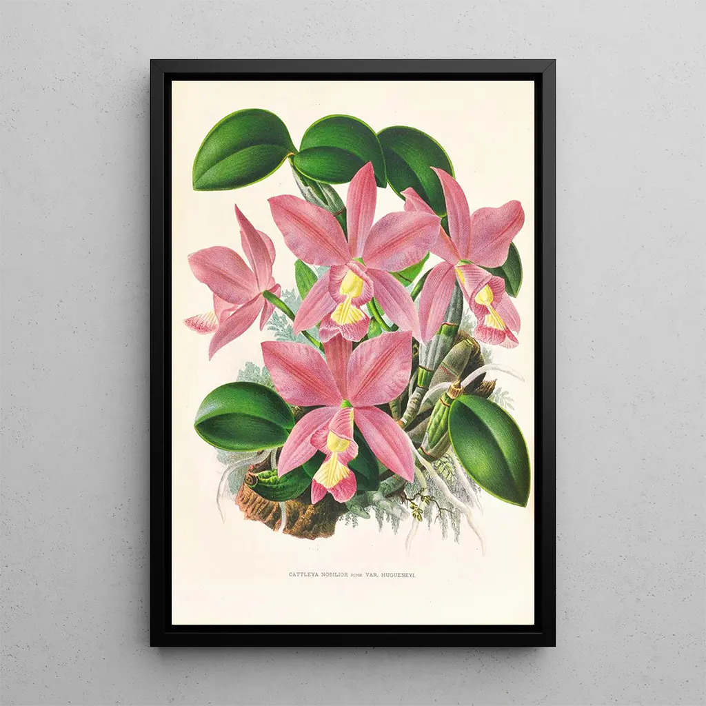 Konsttrycket av Cattleya nobilior förflyttar oss till en värld av grace och elegans, där varje kronblad tycks dansa under ljuset. Jean Jules Linden, med sin exceptionella talang, lyckas att för evigt bevara denna sällsynta orkidéers prakt. De delikata nyanser av rosa och vitt blandas subtilt, vilket skapar en mjuk och lugnande atmosfär. Denna tavla inbjuder till eftertanke och avslöjar naturens inneboende skönhet genom noggranna detaljer och en harmonisk komposition. Linden's verk är en verklig hyllning till flora, en homage till de exotiska växternas prakt.